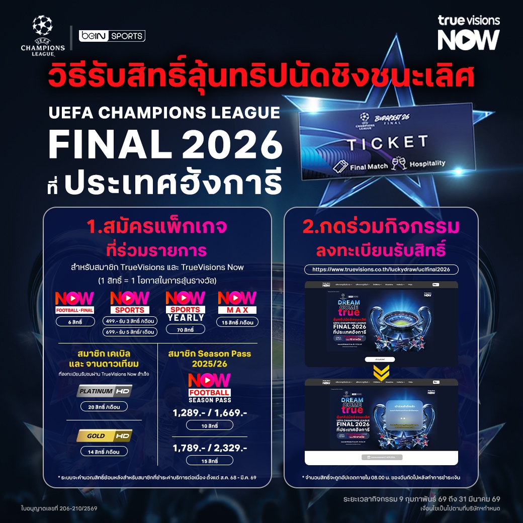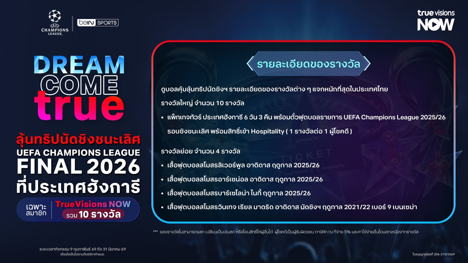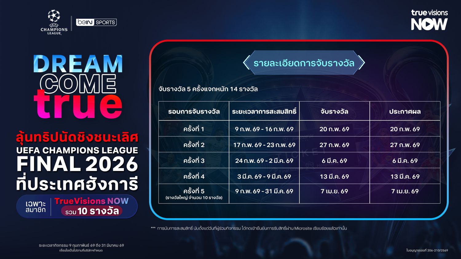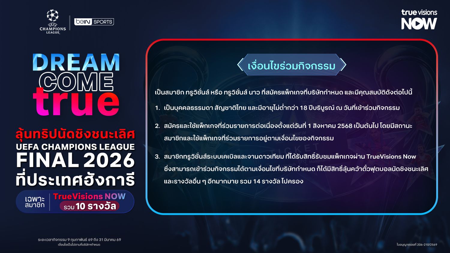 1. กิจกรรม “Dream Come True – ลุ้นทริปนัดชิงชนะเลิศ UEFA Champions League FINAL 2026 ที่ประเทศฮังการี” นี้ สำหรับผู้ใช้บริการของบริษัท ทรู วิชั่นส์ กรุ๊ป จำกัด และ บริษัท ไบรท์นาว จำกัด (รวมเรียกว่า “บริษัท”) ซึ่งเป็นสมาชิก ทรู วิชั่นส์ หรือ ทรู วิชั่นส์ นาว ในนามบุคคลธรรมดา ที่มีสถานะของการใช้งานเป็นปกติ (Active Status) (“ผู้ใช้บริการ”) โดยผู้ใช้บริการต้องสมัครแพ็กเกจตามเงื่อนไขในการเข้าร่วมกิจกรรม และทำการยืนยันการรับสิทธิ์ผ่าน Microsite ให้เรียบร้อย (“ผู้ร่วมกิจกรรม”) โดยกิจกรรมนี้ จัดขึ้นตั้งแต่วันที่ 9 กุมภาพันธ์ 2569 ถึงวันที่ 31 มีนาคม 2569 หรือจนกว่าจะมีการแจ้งเปลี่ยนแปลงจากบริษัท