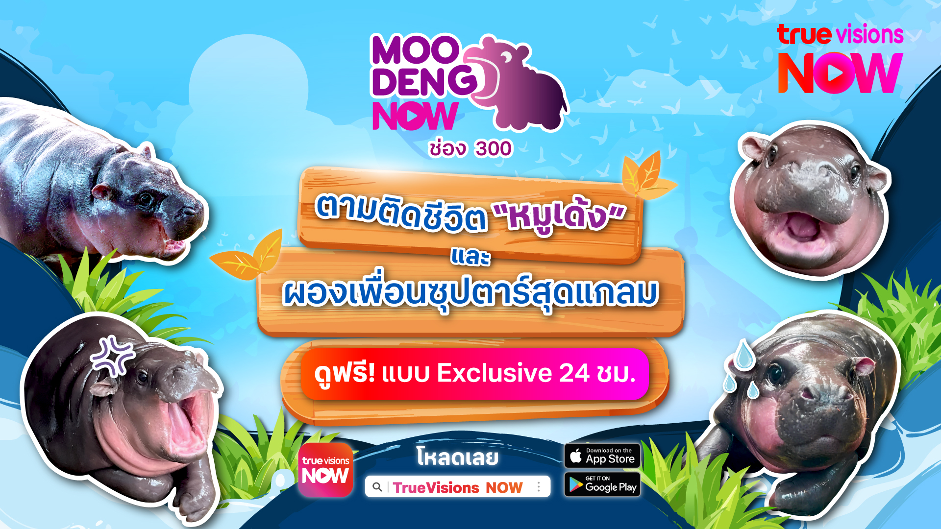 After listening to "Moo Deng Moo Deng," don't forget to catch daily updates about Moo Deng in the "Moo Deng Diary" show, airing daily from 7:00 - 7:15 PM on Moodeng Now (channel 300), True X-Zyte (channel 340), and True Explore Wild (channel 559). You can also follow Moo Deng and their glamorous superstar friends for free, 24 hours a day, on Moodeng Now (channel 300) exclusively on the TrueVisions Now app!