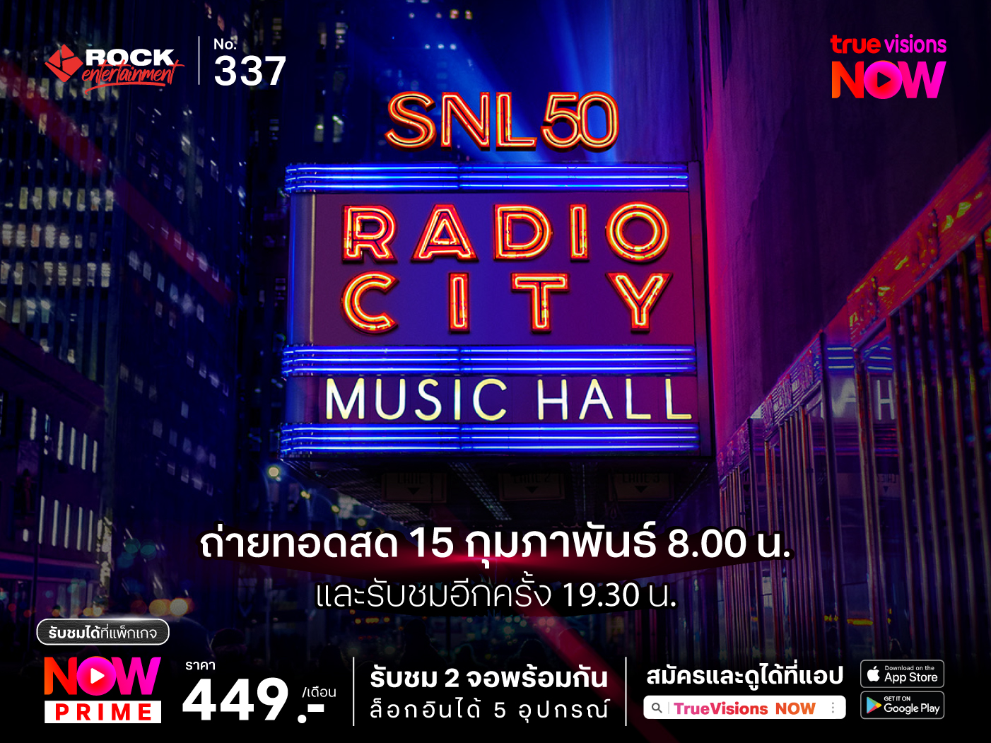 ร่วมเป็นส่วนหนึ่งของการเฉลิมฉลองครั้งสำคัญกับคอนเสิร์ต SNL50: The Homecoming Concert ถ่ายทอดสด! วันเสาร์ที่ 15 กุมภาพันธ์ เวลา 8.00 น. และรับชมได้อีกครั้งในเวลา 19.30 น. ทางช่อง ROCK entertainment ทรูวิชั่นส์หมายเลข 337 และแอปทรูวิชั่นส์ นาว แพ็กเกจ NOW PRIME เป็นต้นไป