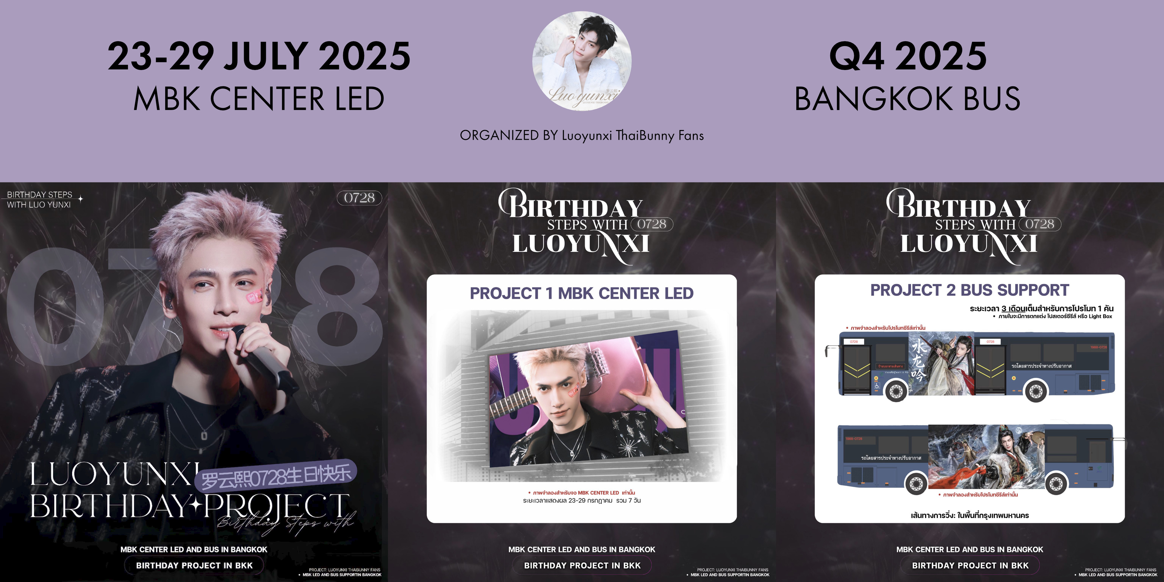 กลุ่มแฟนคลับ Luoyunxi ThaiBunny Fans ขอเชิญทุกคนมาร่วมเป็นส่วนหนึ่งของการเฉลิมฉลองวันเกิดของหลัวอวิ๋นซี ที่ MBK Center กับคอนเซปต์สุดเก๋ "The One and Only Star – เปล่งประกายให้โลกได้เห็น!" ด้วยความตั้งใจของโปรเจกต์ที่เต็มเปี่ยมไปด้วยความรักที่พวกเราเหล่ากระต่ายแสดงออกผ่านจอ แค่ได้เห็นชื่อของเขาส่องสว่างท่ามกลางเมืองใหญ่ก็เหมือนเป็นการบอกให้รู้ว่า "เรายังอยู่ตรงนี้" และพร้อมก้าวไปกับเขาเสมอ