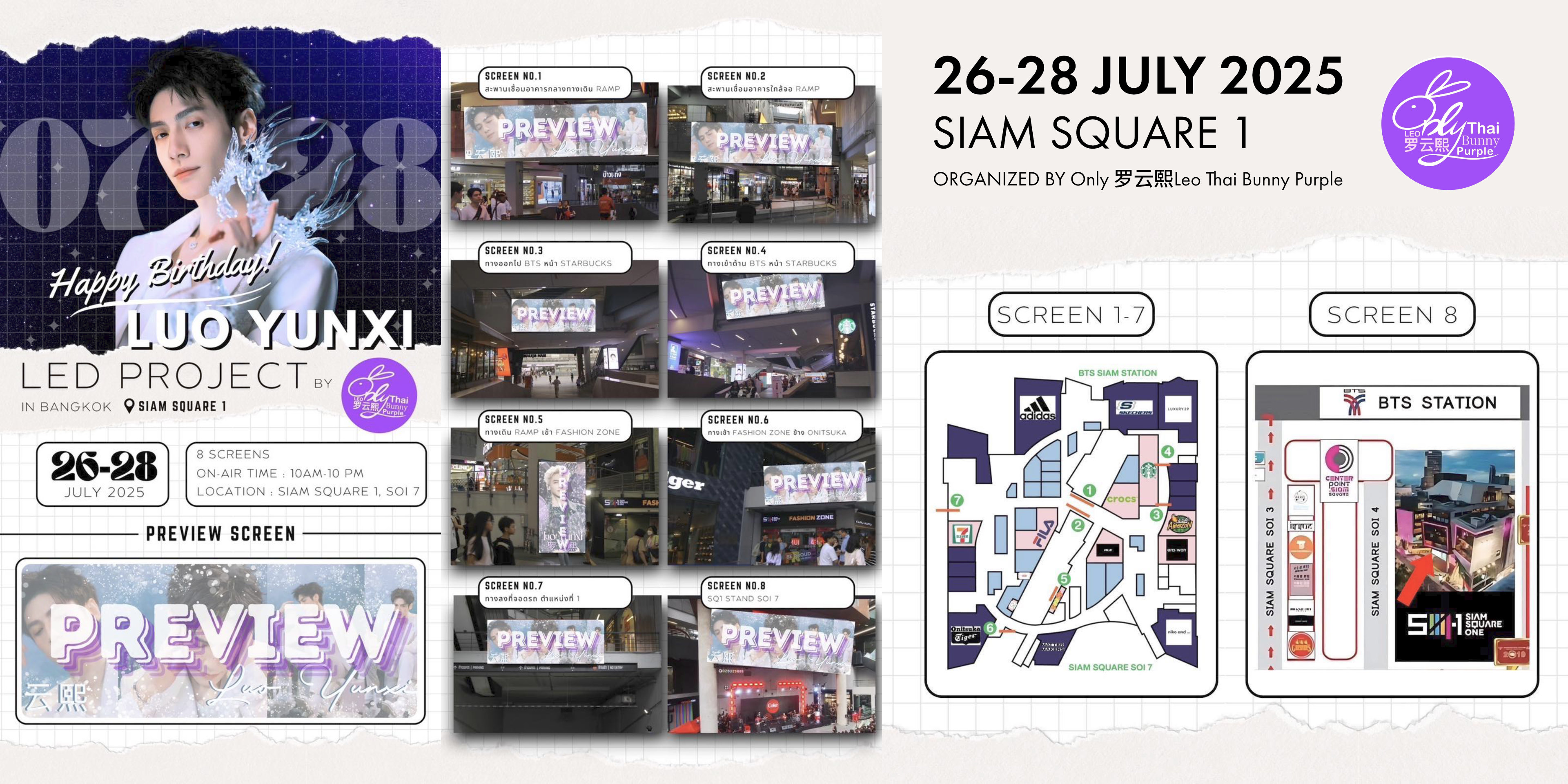 กลุ่มแฟนคลับบ้านกระต่ายม่วง Only罗云熙LeoThaiBunnyPurple ขอเชิญแฟนๆ ของพี่ซีทุกคนสัมผัสกับโปรเจกต์สุดยิ่งใหญ่เพื่อร่วมส่งแรงรักและพลังใจ อวยพรวันเกิดให้หลัวอวิ๋นซี ผ่าน 8 จอ LED ใจกลางกรุงเทพฯ