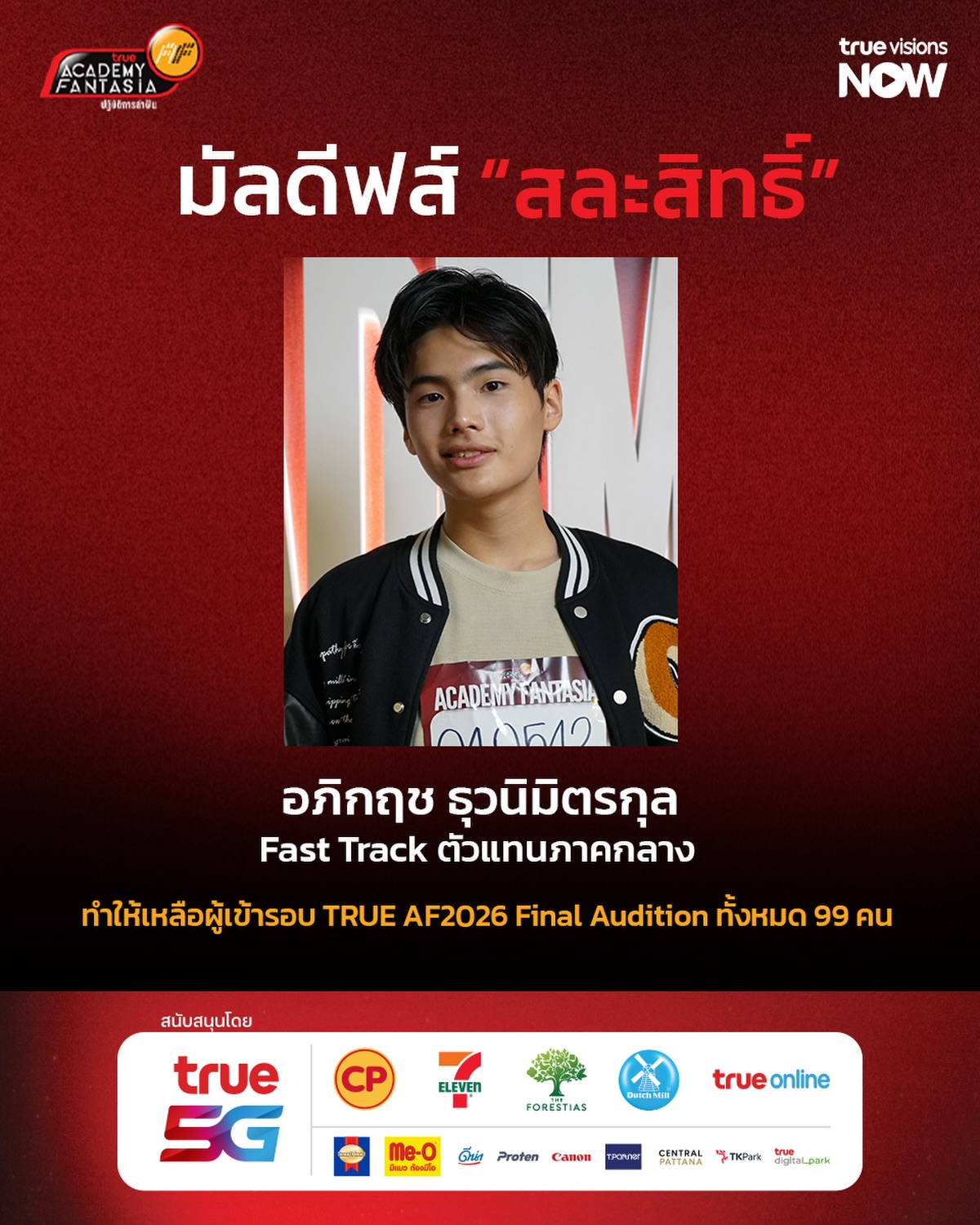 สร้างความประหลาดใจให้กับแฟนรายการและคณะกรรมการไม่น้อย เมื่อ 'มัลดีฟส์' 'อภิกฤช ธุวนิมิตรกุล' จูเนียร์โมเดลมากความสามารถ เจ้าของรางวัลระดับโลก ประกาศสละสิทธิ์จากการเป็นตัวแทนภาคกลาง Fast Track ของ TrueAF 2026 ทำให้รอบFinal Audition ส่งผลให้จำนวนผู้เข้ารอบสุดท้ายลดลงเหลือ 99 คน