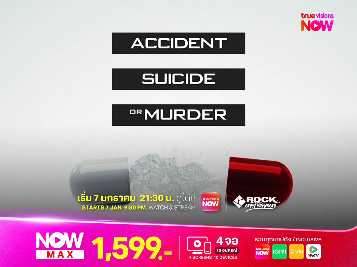 ข่าวดีสำหรับแฟนๆ รายการประเภทสืบสวนหาความจริง หรือ True Crime เพราะ ROCK entertainment เตรียมนำรายการ Accident, Suicide or Murder รายการยอดนิยมในสหรัฐอเมริกามาให้ชมกันแบบเต็มอิ่มจุใจ พุธที่ 7 มกราคมนี้