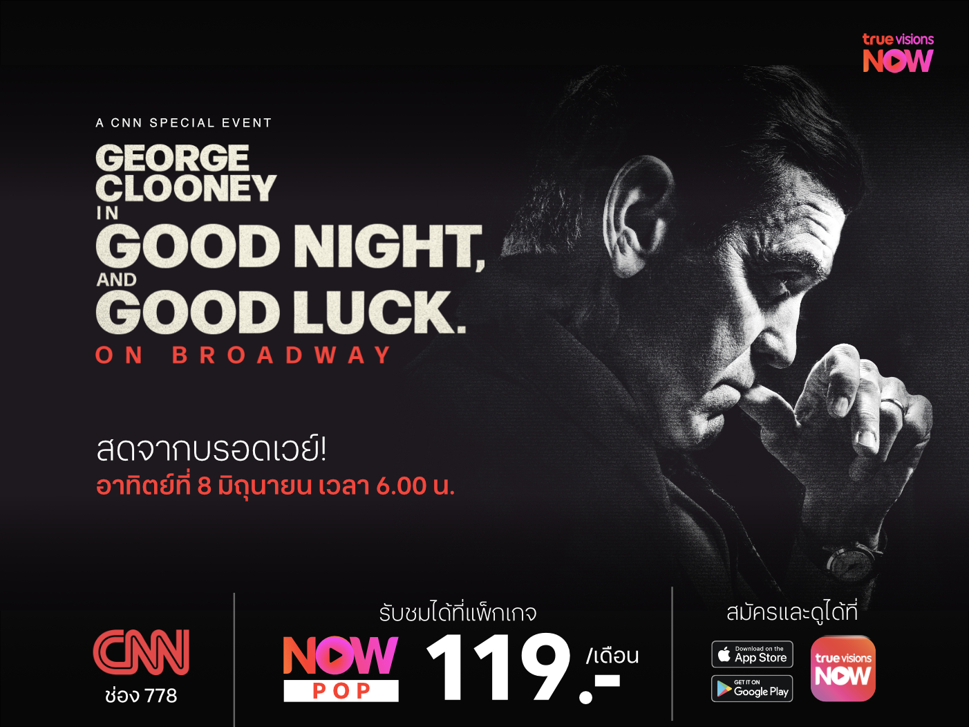 ร่วมเป็นส่วนหนึ่งของประวัติศาสตร์หน้าใหม่ของวงการโทรทัศน์ ในการถ่ายทอดสดละครบรอดเวย์ เรื่อง Good Night, and Good Luck ส่งตรงจากโรงละครวินเทอร์ การ์เดน นิวยอร์ค สหรัฐอเมริกา เช้าวันอาทิตย์ที่ 8 มิถุนายนนี้ 6.00 น. เป็นต้นไป ถ่ายทอดสดทางช่อง CNN ทรูวิชั่นส์ 778 และแอปทรูวิชั่นส์ นาว