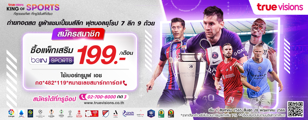 แพ็กเกจเสริม BeIN Sports จาก ทรูวิชั่นส์ ที่จัดเต็มบอลถ้วยสโมสรยุโรป และลีกชั้นนำ จากทั่วโลก ไม่ว่าจะเป็น ยูฟ่า แชมเปี้ยนส์ลีก ยูฟ่า ยูโรป้าลีก ยูฟ่า ยูโรปา คอนเฟอเรนซ์ลีก เอฟเอ คัพ เป็นต้น พร้อมด้วยลีกชั้นนำ ไม่ว่าจะเป็น ลีกเอิง ฝรั่งเศส เซเรีย อา อิตาลี ลาลีกา สเปน สก๊อตติช พรีเมียร์ลีก เป็นต้น ในราคา 199 บาท ต่อเดือน