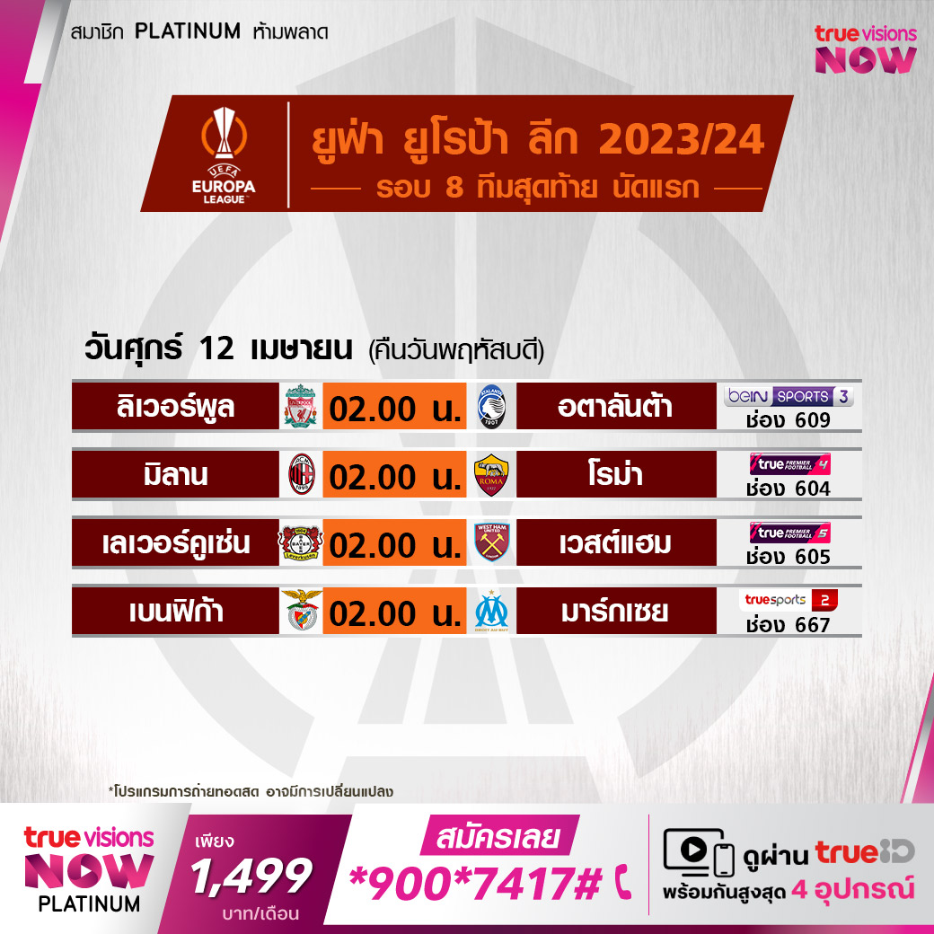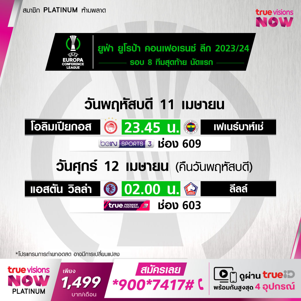 วันนี้มีอะไรดูที่ ทรูวิชั่นส์ ประจำวันพฤหัสบดีที่ 11 เมษายน 67 ยังคงมีกีฬาที่น่าสนใจให้ได้ตามลุ้นตามเชียร์กันเหมือนเดิม โดยในส่วนของฟุตบอลนั้นยังมีศึกยูฟ่า ยูโรป้า ลีก และ ยูฟ่า ยูโรป้า คอนเฟอเรนซ์ ลีก ในรอบก่อนรองชนะเลิศนัดแรก ให้ได้ตามเชียร์กันต่อเนื่อง รวมถึงศึกฟุตบอล ซาอุดิ ซูเปอร์ คัพ 2024 ส่วนกีฬาอื่นๆ ยังมีเทนนิส เอทีพี ทัวร์ รายการ มอนติ คาร์โล มาสเตอร์ส, กอล์ฟเมเจอร์รายการแรกของปี เดอะ มาสเตอร์ส ทัวร์นาเมนท์ 2024 และบาสเกตบอลเอ็นบีเอ งานนี้ ทรูวิชั่นส์ จัดเต็มให้ชมกันถึงบ้าน