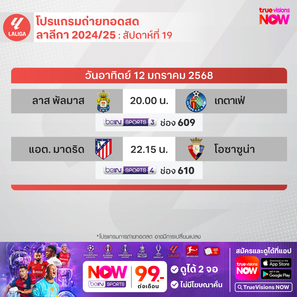 Las Palmas vs Getafe เวลา 20.00-22.00 ทางช่อง beIN 3 (609)