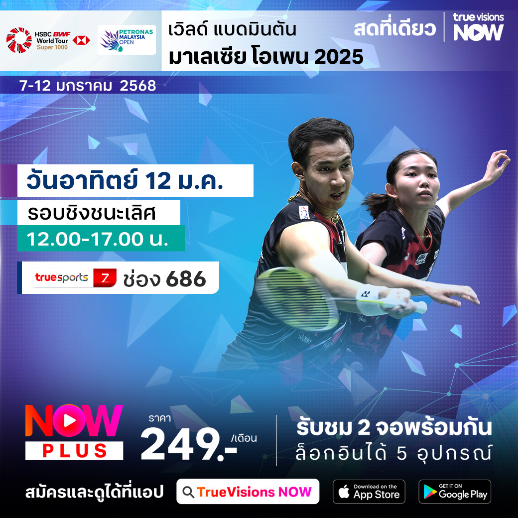 แบดมินตัน บีดับเบิ้ลยูเอฟ เปิดฤดูกาลใหม่ กับความมันส์ระดับ เวิลด์ ทัวร์ ซูเปอร์ 1000 มาเลเซีย โอเพ่น 2025 ที่ระดมเอามือท็อปของโลกทั้งชายและหญิงจากทุกทวีป ร่วมเชียร์นักแบดมินตันไทยที่คัดมือดีที่สุดไปร่วมแข่งขัน ที่มีคะแนนสะสมและเงินรางวัลให้ชิงกันมากถึง 1,450,000 เหรียญสหรัฐฯ ใครจะคว้าชัย ใครจะไปต่อถึงตำแหน่งแชมป์ ชมสดครบทุกรอบ เอ็กซ์คลูซีฟ ที่เดียวที่ ทรูวิชั่นส์