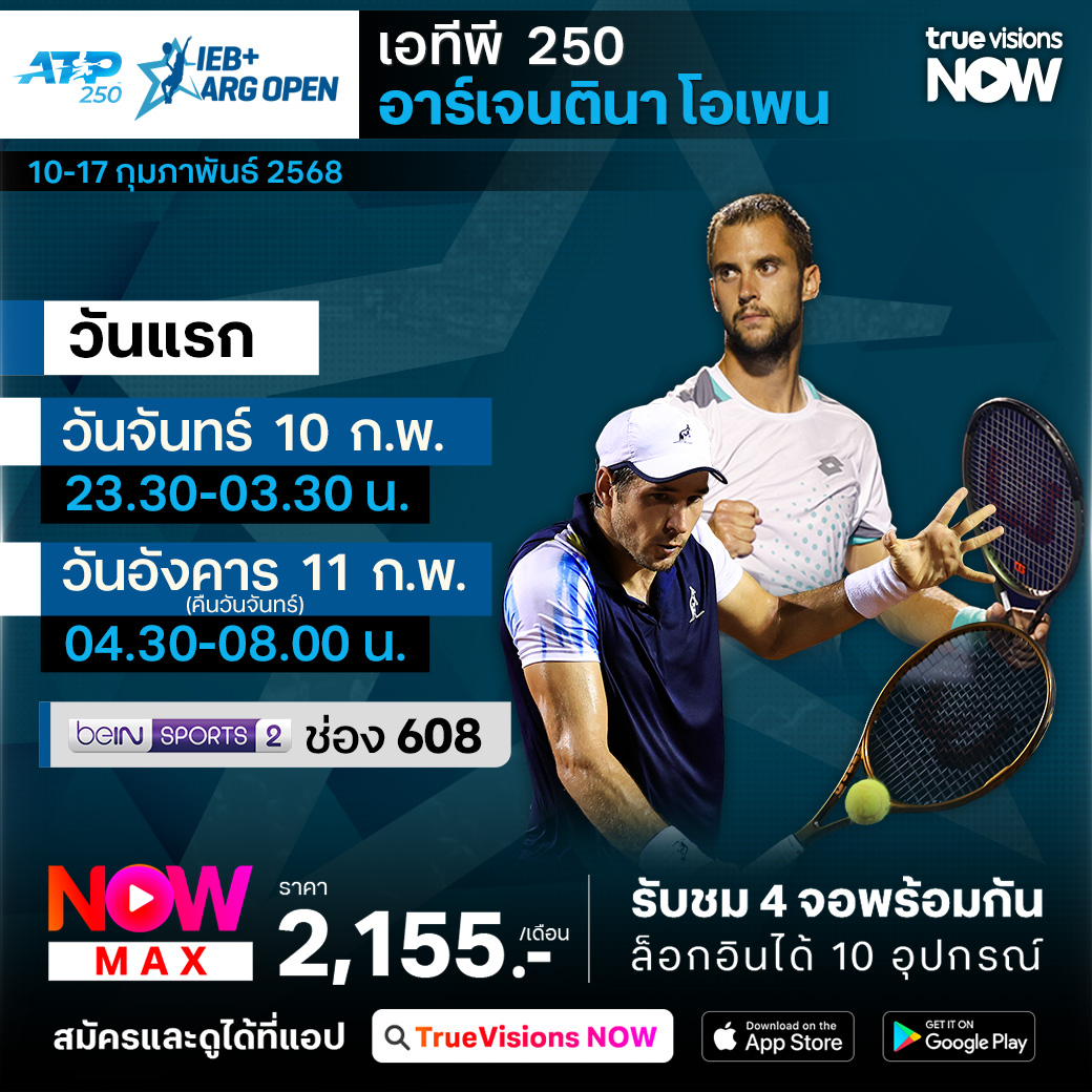เทนนิสชาย เอทีพี ทัวร์ เข้าสู่ช่วงการแข่งขันโกลเด้น สวิง หรือการแข่งขันในทวีปอเมริกาใต้ สัปดาห์นี้ไปกันที่กรุงบวยโนสไอเรส ประเทศอาร์เจนติน่า กับรายการ อาร์เจนติน่า โอเพ่น โดยนักเทนนิสที่เข้าร่วมการแข่งขันช่วงนี้ต้องปรับตัวจากการแข่งขันบนฮาร์ทคอร์ท มาสู่การแข่งขันบนคอร์ทดิน ร่วมลุ้นกันว่านักเทนนิสคนไหนจะคว้าแชมป์ไปครอง ชมสด ครบทุกรอบ ที่ ทรูวิชั่นส์