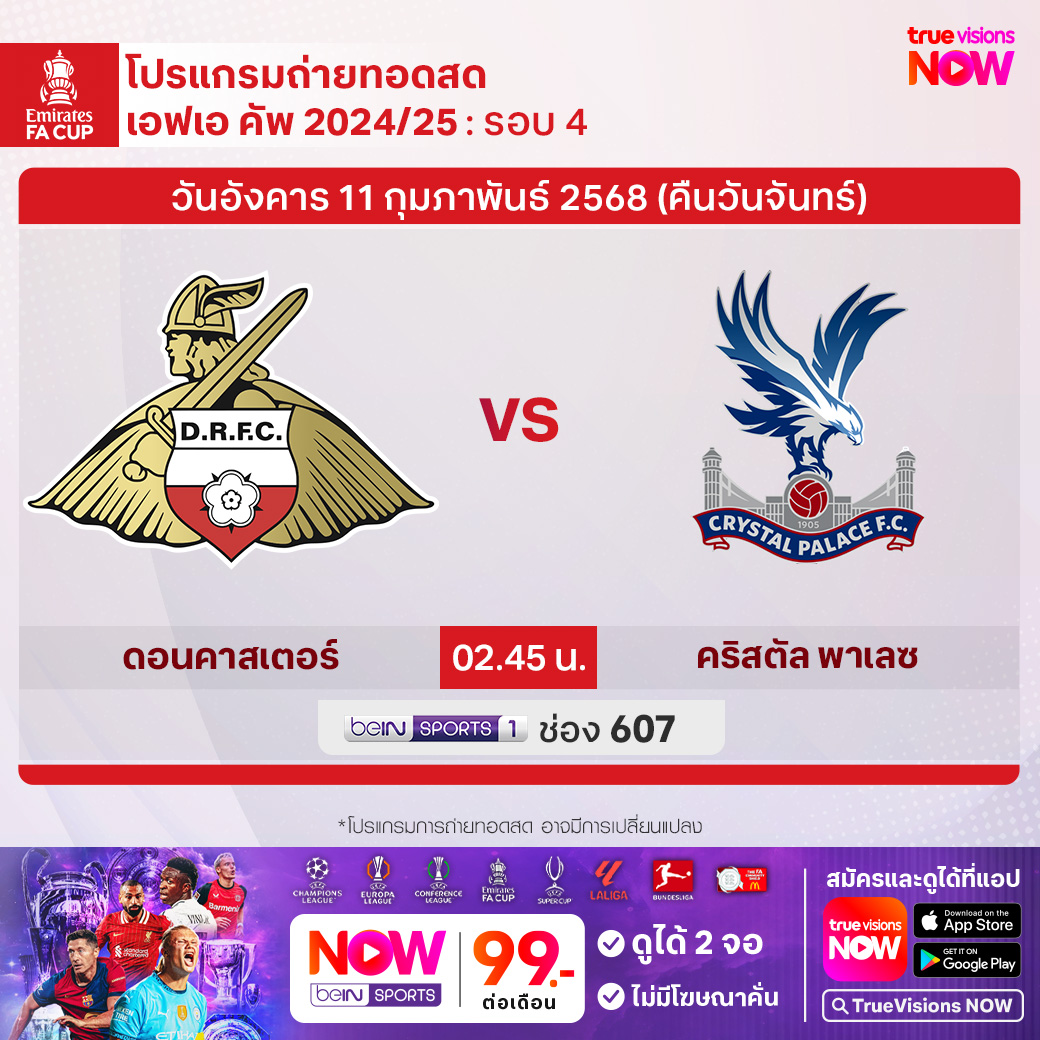 Doncaster vs Crystal Palace เวลา 02.45-04.45 ทางช่อง beIN 1 (607)