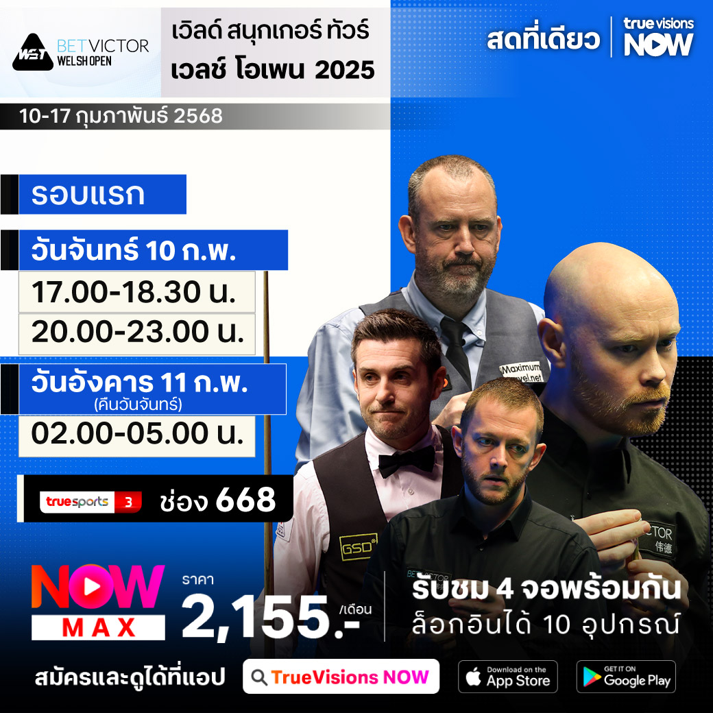 ศึก เวิลด์ สนุกเกอร์ ทัวร์ สัปดาห์นี้พบกับรายการ เวลช์ โอเพ่น 2025 รายการสุดท้ายของ โฮม เนชั่นส์ ซีรี่ส์ ที่สังเวียน เวนูซิมรู ในแคว้นเวลส์ สหราชอาณาจักร นักสอยคิวมือดีระดับท็อปของ เวิลด์ แรงค์กิ้ง ไปร่วมแข่งขันและแย่งแชมป์กันคับคั่ง โดยแชมป์จะได้รับถึง 100,000 ปอนด์ และลุ้นโบนัสอีก 150,000 ปอนด์ สำหรับคะแนนรวมสูงสุดของซีรี่ส์ ชมสด เอ็กซ์คลูซีฟ รอบแรกถึงรอบชิงชนะเลิศ ที่เดียวที่ ทรูวิชั่นส์