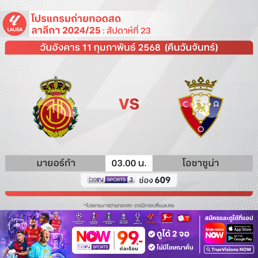 Mallorca vs Osasuna เวลา 03.00-05.00 ทางช่อง beIN 3 (609)