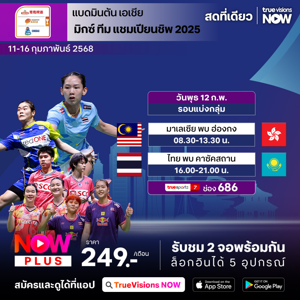 พักรบเรื่องเก็บคะแนนสะสมโลกและมาเอาใจช่วยทีมชาติ กับศึกแห่งศักดิ์ศรีระดับชิงแชมป์ทวีป สัปดาห์นี้ แฟนๆ กีฬาแบดมินตันจะได้สัมผัสบรรยากาศของความสนุกตื่นเต้น ในรูปแบบของทีมผสมชิงแชมป์เอเชีย หรือ เอเชีย มิกซ์ ทีม แชมเปี้ยนชิพ 2025 ที่เมืองชิงเต่า ประเทศจีน ร่วมส่งใจเชียร์ทีมชาติไทย สู้สุดใจเพื่อคว้าชัยเหนือคู่แข่งระดับโลกของเอเชีย ชมสด จุใจ เอ็กซ์คลูซีฟ ที่เดียวที่ ทรูวิชั่นส์
