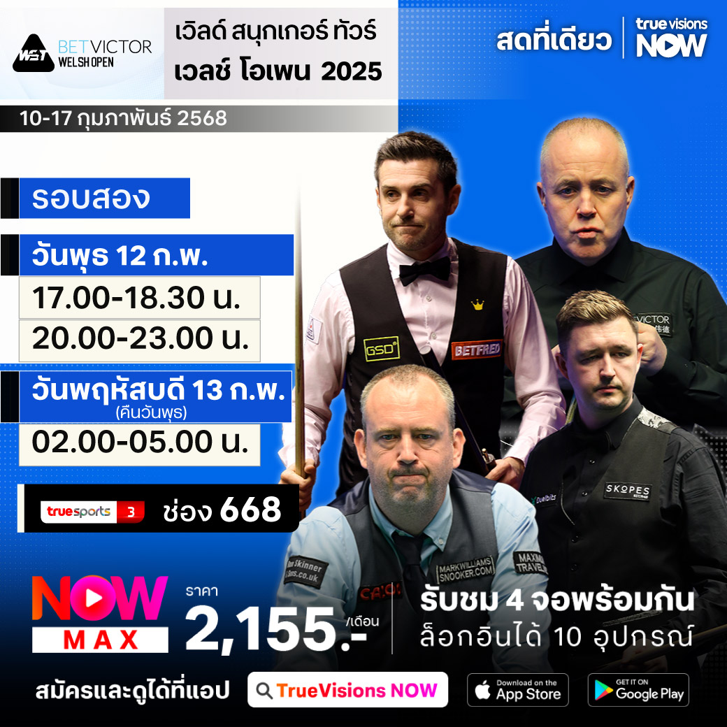 ศึก เวิลด์ สนุกเกอร์ ทัวร์ สัปดาห์นี้พบกับรายการ เวลช์ โอเพ่น 2025 รายการสุดท้ายของ โฮม เนชั่นส์ ซีรี่ส์ ที่สังเวียน เวนูซิมรู ในแคว้นเวลส์ สหราชอาณาจักร นักสอยคิวมือดีระดับท็อปของ เวิลด์ แรงค์กิ้ง ไปร่วมแข่งขันและแย่งแชมป์กันคับคั่ง โดยแชมป์จะได้รับถึง 100,000 ปอนด์ และลุ้นโบนัสอีก 150,000 ปอนด์ สำหรับคะแนนรวมสูงสุดของซีรี่ส์ ชมสด เอ็กซ์คลูซีฟ รอบแรกถึงรอบชิงชนะเลิศ ที่เดียวที่ ทรูวิชั่นส์