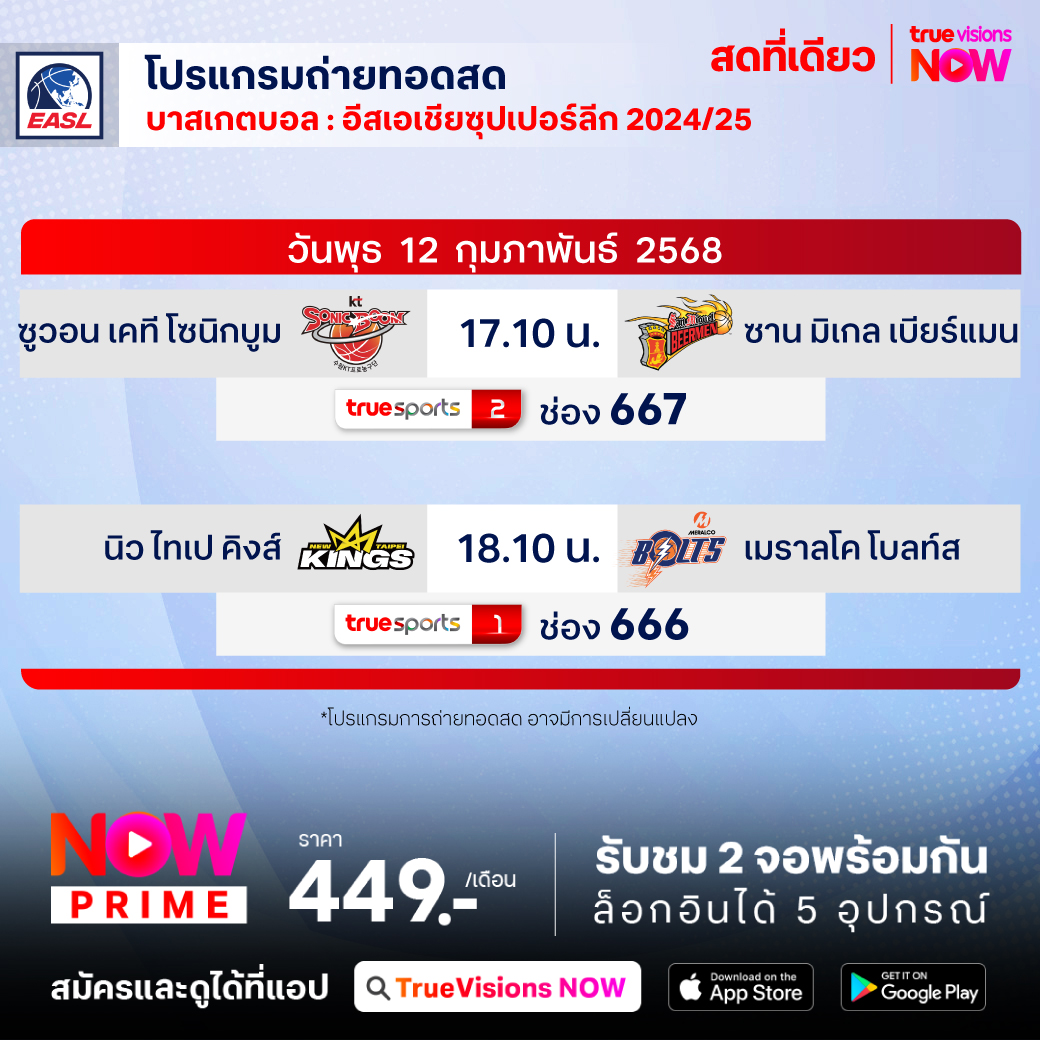 วันนี้มีอะไรดูที่ ทรูวิชั่นส์ ประจำวันพุธที่ 12 กุมภาพันธ์ 68 ยังคงมีกีฬาที่น่าสนใจให้ได้ตามลุ้นตามเชียร์กันเหมือนเดิม โดยในส่วนของฟุตบอลนั้นยังมีศึกพรีเมียร์ลีก อังกฤษ, ยูฟ่า แชมเปี้ยนส์ ลีก รอบ น็อคเอาท์ เฟส เพลย์ออฟ นัดแรก และ ไทยลีก 2 ให้ได้ตามเชียร์กันต่อ ส่วนกีฬาอื่นๆ ยังมีเทนนิส เอทีพี ทัวร์ รายการ อาร์เจนติน่า โอเพ่น, ดับเบิ้ลยูทีเอ ทัวร์ รายการ กาตาร์ โอเพ่น, แบดมินตัน รายการ เอเชีย มิกซ์ ทีม แชมเปี้ยนชิพ, เวิลด์ สนุกเกอร์ ทัวร์ รายการ เวลช์ โอเพ่น และ บาสเกตบอล อีสต์ เอเชีย ซูเปอร์ ลีก งานนี้ ทรูวิชั่นส์ จัดเต็มให้ชมกันถึงบ้าน