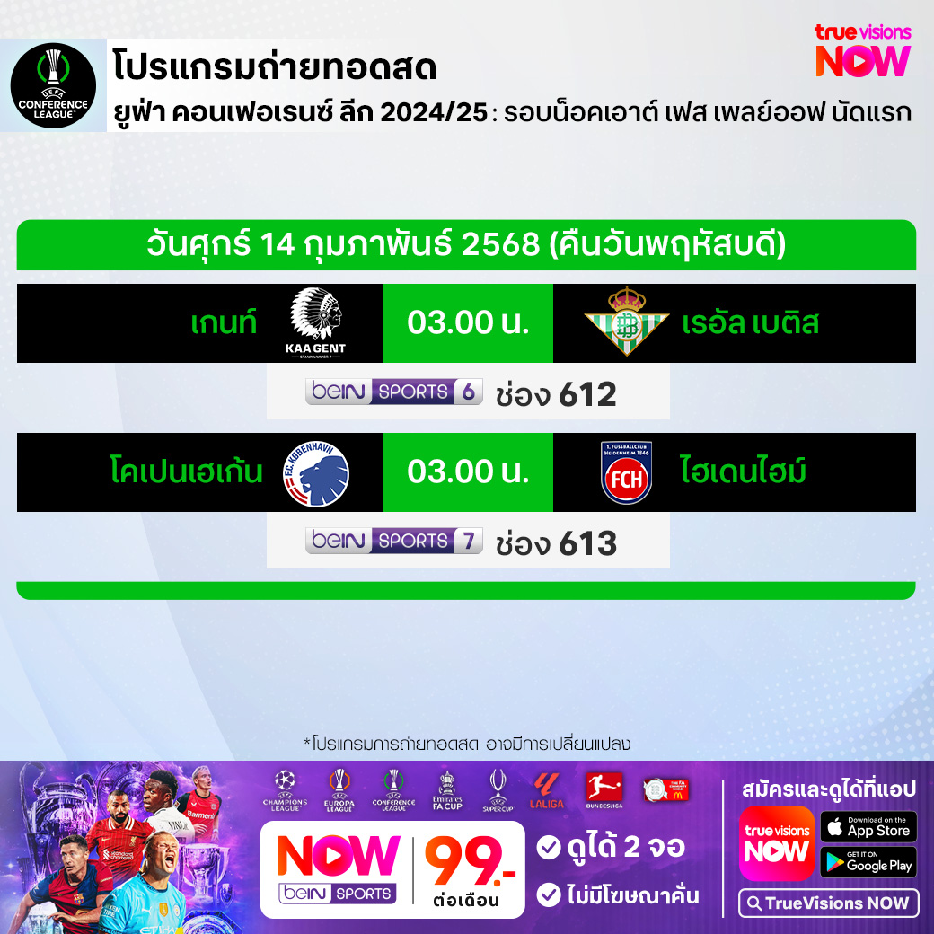 วันนี้มีอะไรดูที่ ทรูวิชั่นส์ ประจำวันพฤหัสบดีที่ 13 กุมภาพันธ์ 68 ยังคงมีกีฬาที่น่าสนใจให้ได้ตามลุ้นตามเชียร์กันเหมือนเดิม โดยในส่วนของฟุตบอลนั้นยังมีศึก ยูฟ่า ยูโรป้า ลีก และ ยูฟ่า คอนเฟอเรนซ์ ลีก รอบ น็อคเอาท์ เฟส เพลย์ออฟ นัดแรก และ ซาอุดิ โปร ลีก ให้ได้ตามเชียร์กันต่อ ส่วนกีฬาอื่นๆ ยังมีเทนนิส เอทีพี ทัวร์ รายการ อาร์เจนติน่า โอเพ่น, ดับเบิ้ลยูทีเอ ทัวร์ รายการ กาตาร์ โอเพ่น, กอล์ฟ พีจีเอ ทัวร์ รายการ เดอะ เจเนซิส อินวิเตชั่นแนล, แบดมินตัน รายการ เอเชีย มิกซ์ ทีม แชมเปี้ยนชิพ และ เวิลด์ สนุกเกอร์ ทัวร์ รายการ เวลช์ โอเพ่น งานนี้ ทรูวิชั่นส์ จัดเต็มให้ชมกันถึงบ้าน