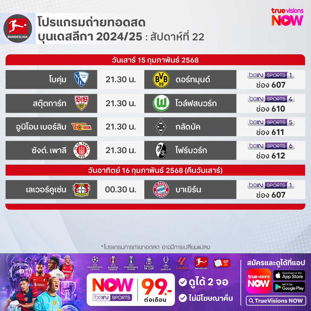 Bochum vs Dortmund เวลา 21.30-23.30 ทางช่อง beIN 1 (607)