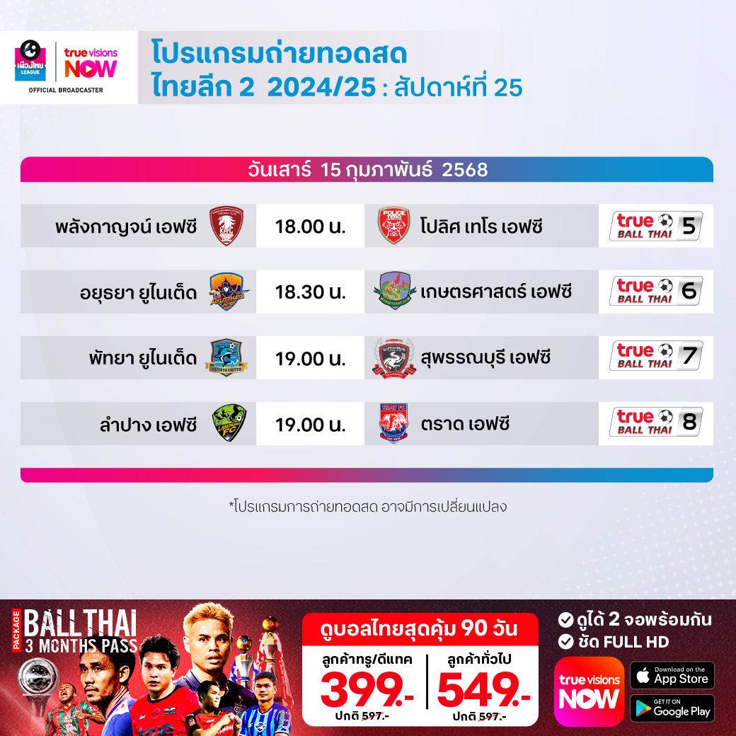 พัทยา ยูไนเต็ด พบ สุพรรณบุรี เอฟซี เวลา 19.00-21.00 ทางช่อง True Ball Thai 7