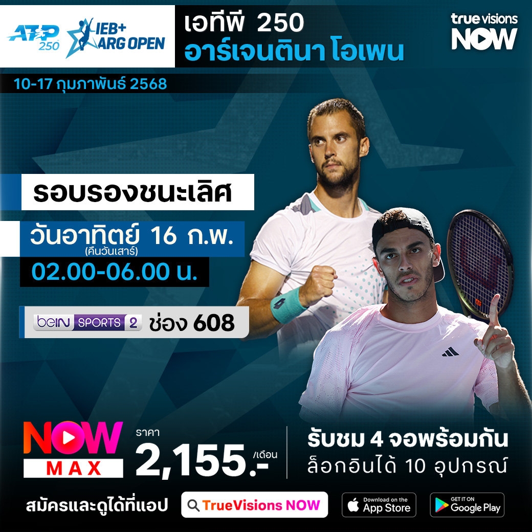เทนนิสชาย เอทีพี ทัวร์ เข้าสู่ช่วงการแข่งขันโกลเด้น สวิง หรือการแข่งขันในทวีปอเมริกาใต้ สัปดาห์นี้ไปกันที่กรุงบวยโนสไอเรส ประเทศอาร์เจนติน่า กับรายการ อาร์เจนติน่า โอเพ่น โดยนักเทนนิสที่เข้าร่วมการแข่งขันช่วงนี้ต้องปรับตัวจากการแข่งขันบนฮาร์ทคอร์ท มาสู่การแข่งขันบนคอร์ทดิน ร่วมลุ้นกันว่านักเทนนิสคนไหนจะคว้าแชมป์ไปครอง ชมสด ครบทุกรอบ ที่ ทรูวิชั่นส์