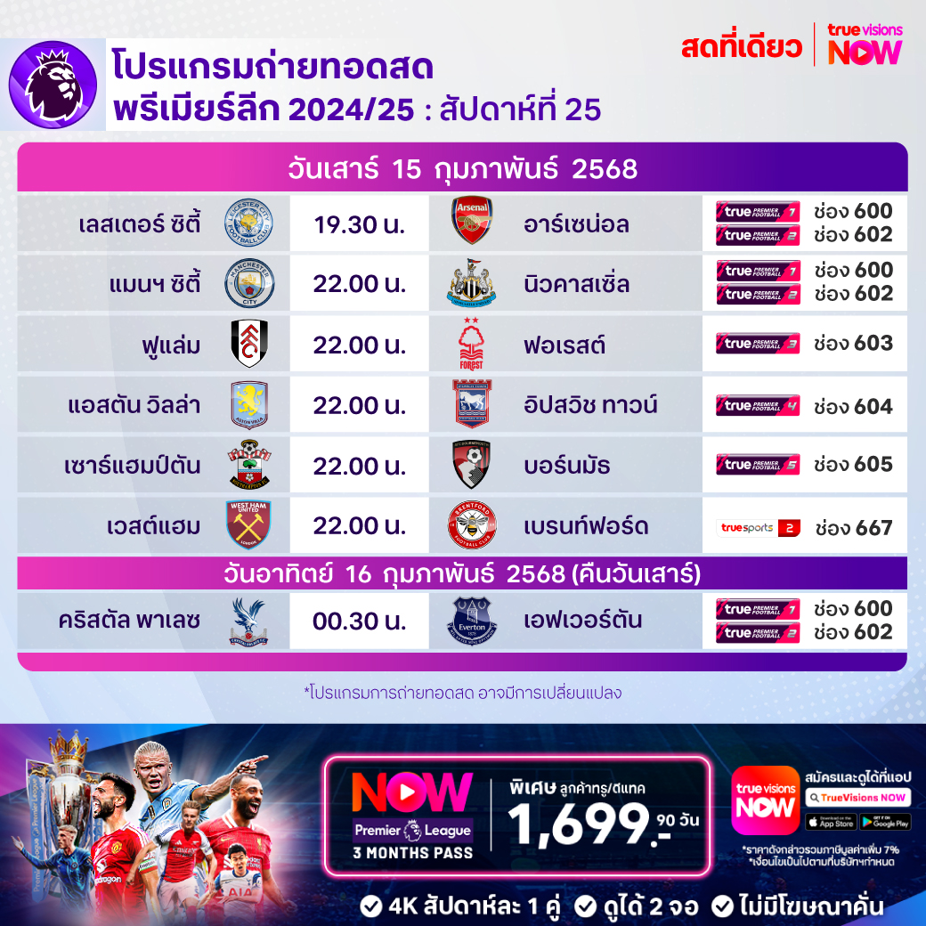 วันนี้มีอะไรดูที่ ทรูวิชั่นส์ ประจำวันเสาร์ที่ 15 กุมภาพันธ์ 68 ยังคงมีกีฬาที่น่าสนใจให้ได้ตามลุ้นตามเชียร์กันเหมือนเดิม โดยในส่วนของฟุตบอลนั้นยังมีศึกพรีเมียร์ลีก อังกฤษ, บุนเดสลีกา เยอรมนี, ลา ลีกา สเปน, เอ-ลีก ออสเตรเลีย, ซาอุดิ โปร ลีก และ ไทยลีก 1, 2 ให้ได้ตามเชียร์กันต่อ ส่วนกีฬาอื่นๆ ยังมีเทนนิส เอทีพี ทัวร์ รายการ อาร์เจนติน่า โอเพ่น, ดับเบิ้ลยูทีเอ ทัวร์ รายการ กาตาร์ โอเพ่น, กอล์ฟ พีจีเอ ทัวร์ รายการ เดอะ เจเนซิส อินวิเตชั่นแนล, ลิฟ กอล์ฟ แอดดิเลด, แบดมินตัน รายการ เอเชีย มิกซ์ ทีม แชมเปี้ยนชิพ, เวิลด์ สนุกเกอร์ ทัวร์ รายการ เวลช์ โอเพ่น, ยูเอฟซี ไฟต์ ไนท์, วอลเลย์บอล แอลโอวีบี และ เอสวีลีก และ บาสเกตบอลเอ็นบีเอ งานนี้ ทรูวิชั่นส์ จัดเต็มให้ชมกันถึงบ้าน