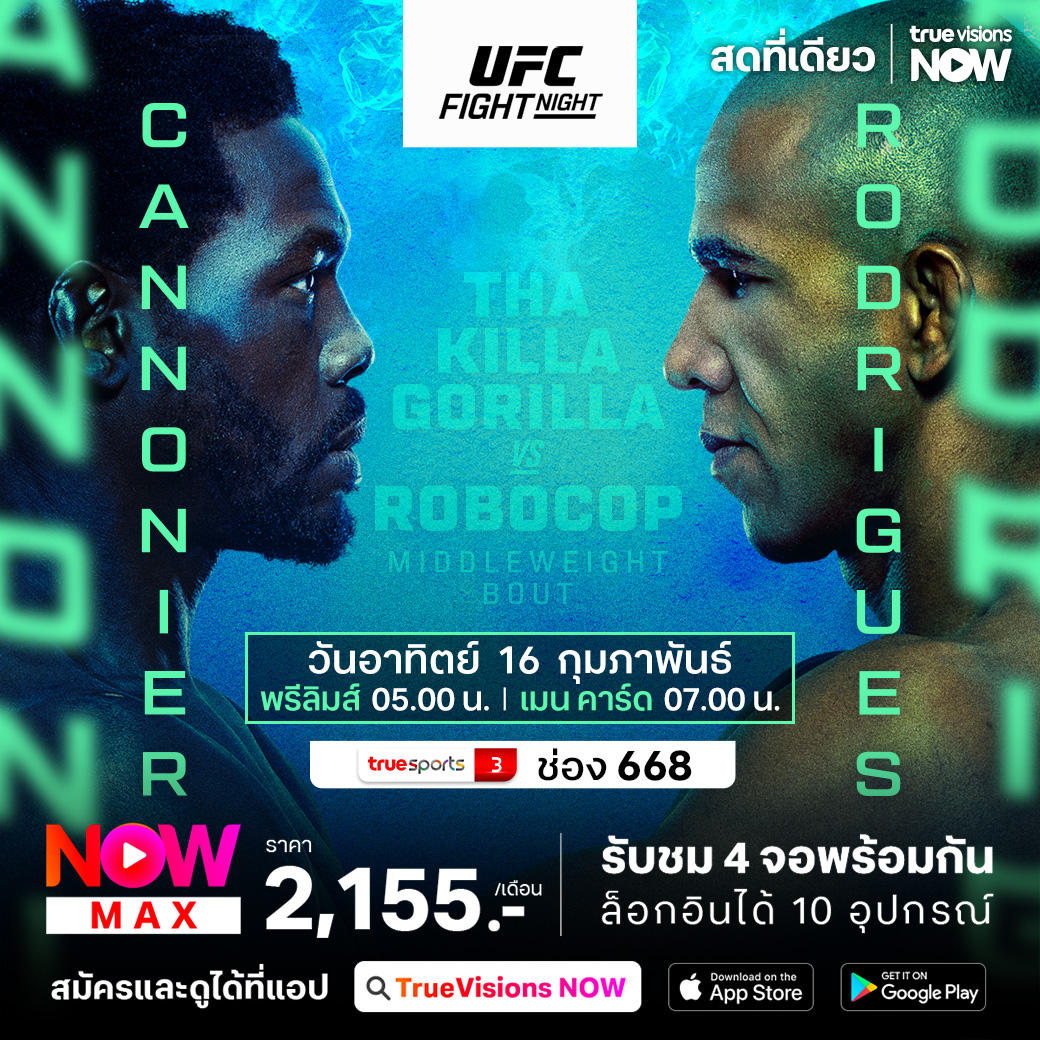ยูเอฟซี ไฟต์ ไนท์ สัปดาห์นี้ ไปมันส์กันแบบสุดๆ ที่ ยูเอฟซี เอเพ็กซ์ ลาส เวกัส สหรัฐอเมริกา คู่เอกแฟนๆ พลาดไม่ได้ จาเร็ค แคนโนเนียร์ อดีตผู้ท้าชิงรุ่นมิดเดิ้ลเวตและรองแชมป์อันดับ 7 ชาวอเมริกัน วัดฝีมือกับนักสู้เชิงสูงจากบราซิล เกรกอรี่ ฮ็อดริเดซ ร่วมด้วยรุ่นเฟเธอร์เวต แคลวิน แค็ตตาร์ อดีตผู้ท้าชิงรุ่นนี้ พบกับ ยุสเซฟ ซาลาล ชมสด เอ็กซ์คลูซีฟ จุใจ ที่ ทรูวิชั่นส์