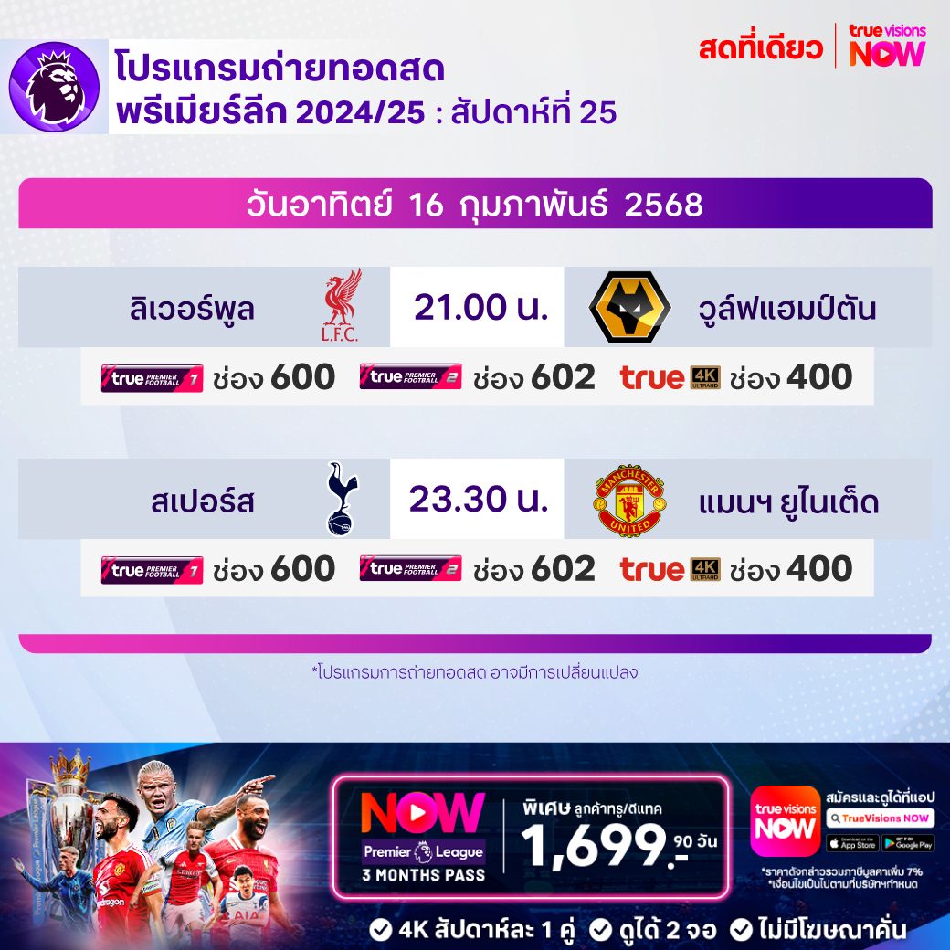 วันนี้มีอะไรดูที่ ทรูวิชั่นส์ ประจำวันอาทิตย์ที่ 16 กุมภาพันธ์ 68 ยังคงมีกีฬาที่น่าสนใจให้ได้ตามลุ้นตามเชียร์กันเหมือนเดิม โดยในส่วนของฟุตบอลนั้นยังมีศึกพรีเมียร์ลีก อังกฤษ, บุนเดสลีกา เยอรมนี, ลา ลีกา สเปน, เอ-ลีก ออสเตรเลีย และ ไทยลีก 2 ให้ได้ตามเชียร์กันต่อ ส่วนกีฬาอื่นๆ ยังมีเทนนิส เอทีพี ทัวร์ รายการ อาร์เจนติน่า โอเพ่น, ดับเบิ้ลยูทีเอ ทัวร์ รายการ ดูไบ ดิวตี้ ฟรี เทนนิส, กอล์ฟ พีจีเอ ทัวร์ รายการ เดอะ เจเนซิส อินวิเตชั่นแนล, ลิฟ กอล์ฟ แอดดิเลด, แบดมินตัน รายการ เอเชีย มิกซ์ ทีม แชมเปี้ยนชิพ, เวิลด์ สนุกเกอร์ ทัวร์ รายการ เวลช์ โอเพ่น, วอลเลย์บอล แอลโอวีบี และ เอสวีลีก และ บาสเกตบอลเอ็นบีเอ งานนี้ ทรูวิชั่นส์ จัดเต็มให้ชมกันถึงบ้าน