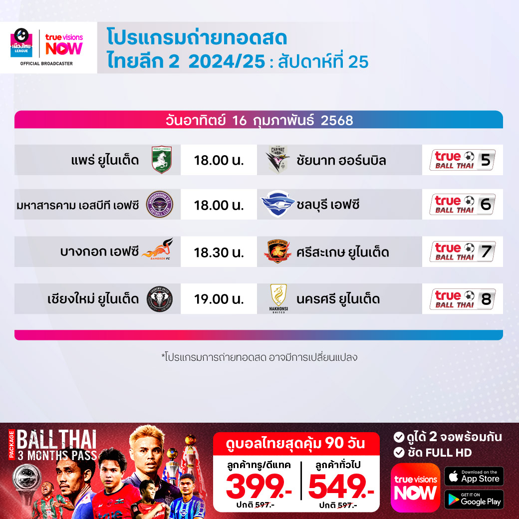 เชียงใหม่ ยูไนเต็ด พบ นครศรี ยูไนเต็ด เวลา 19.00-21.00 ทางช่อง True Ball Thai 8
