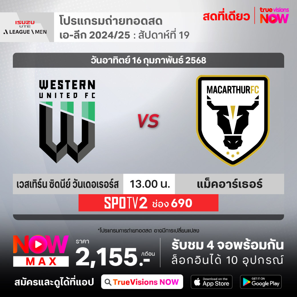 Western Sydney Wanderers vs Macarther เวลา 13.00-15.00 ทางช่อง SPOTV2 (690)