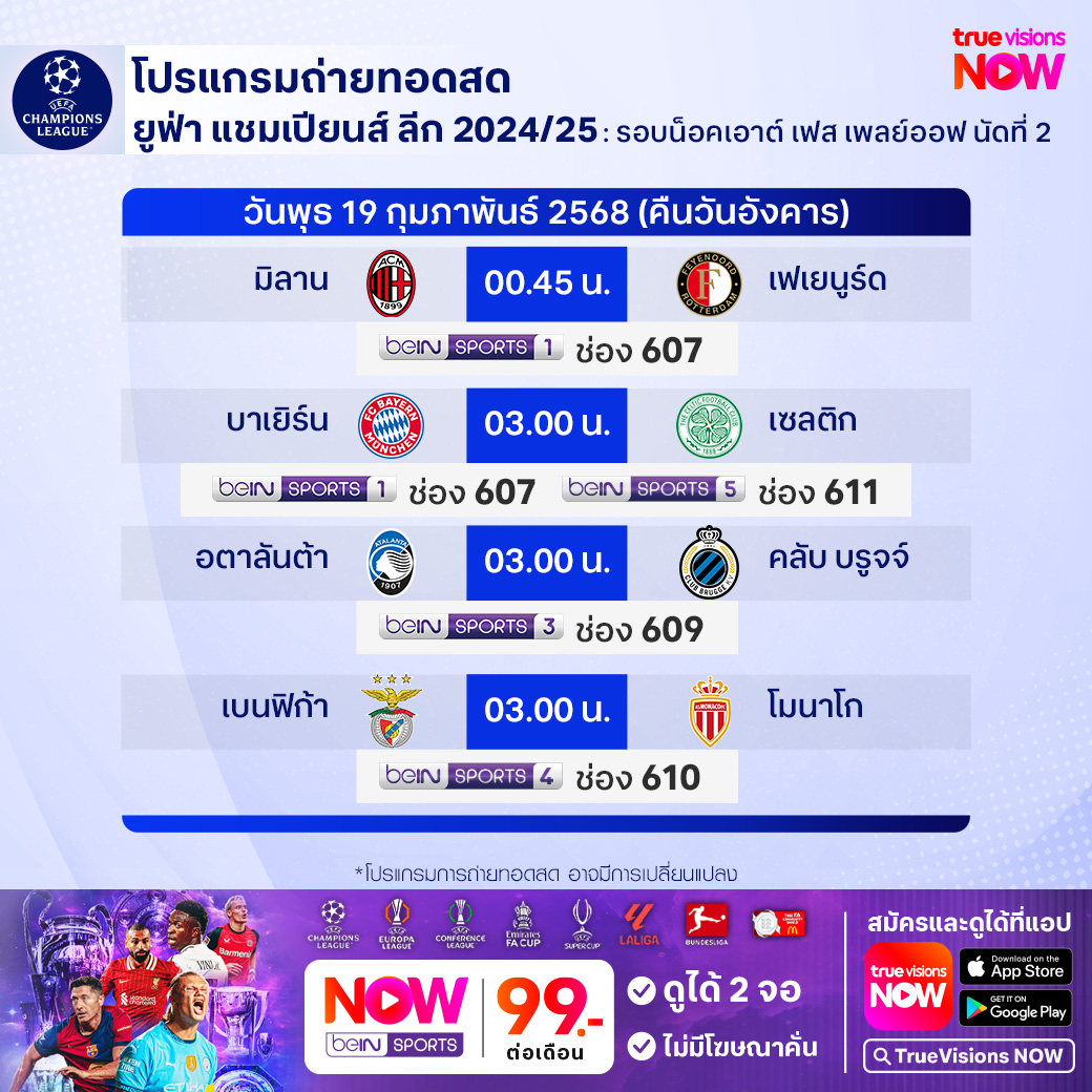 Milan vs Feyenoord เวลา 00.45-02.45 ทางช่อง beIN 1 (607)