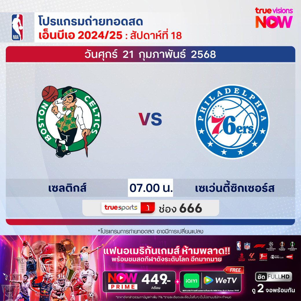 วันศุกร์ 21 กุมภาพันธ์ Celtics Vs 76ers เวลา 07.00 ทางช่อง TS 1 (666)