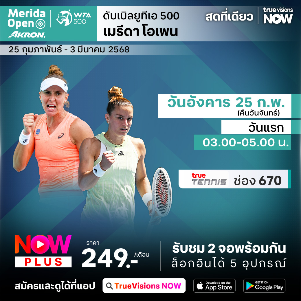 เทนนิสหญิง เอทีพี ทัวร์ สัปดาห์นี้พบกับรายการ เมริด้า โอเพ่น ที่เมืองเมริด้า ประเทศเม็กซิโก รายการที่นักเทนนิสต้องต่อสู้กับสภาพอากาศร้อนชื้นในเมืองเมริด้า และยังเป็นการเตรียมตัวก่อนเข้าสู่ 2 รายการใหญ่ที่จะแข่งขันในเดือนมีนาคม ร่วมลุ้นกันว่าใครจะคว้าแชมป์ไปครอง ชมสด ครบทุกรอบ ที่ ทรูวิชั่นส์