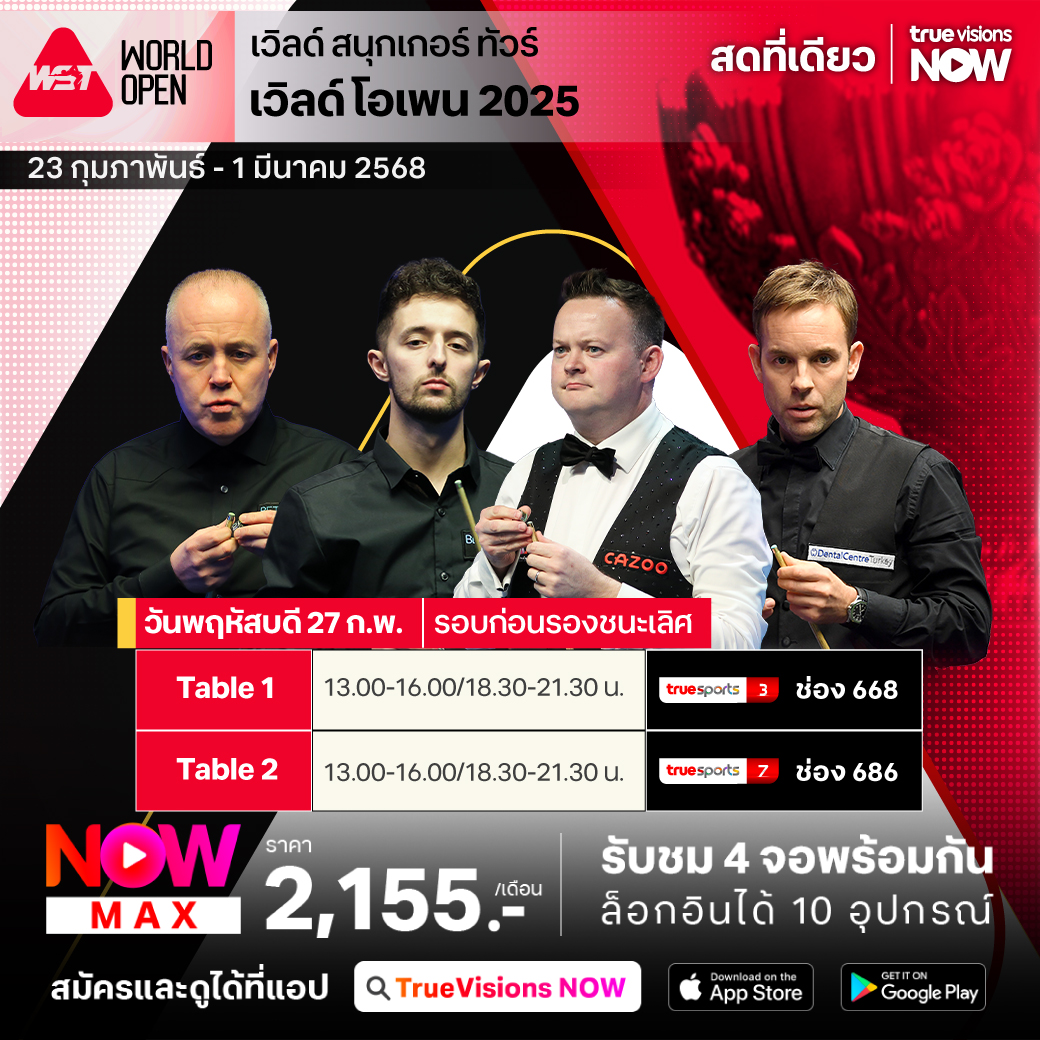 เวิลด์ สนุกเกอร์ ทัวร์ รายการเก็บคะแนนสะสมโลก เดินทางกลับไปเยือนจีนแผ่นดินใหญ่เป็นครั้งที่ 4 ในฤดูกาลนี้ กับรายการที่แฟนๆ รอคอย เวิลด์ โอเพ่น 2025 ที่ ยู่ฉาน ประเทศจีน มือระดับท็อปของ เวิลด์ แรงค์กิ้ง ตบเท้าไปร่วมสอยคิว เพื่อลุ้นเป็นแชมป์กันอย่างคับคั่ง กับเงินรางวัลรวมมหาศาล 825,000 ปอนด์ หรือประมาณ 34.7 ล้านบาท ชมสด เอ็กซ์คลูซีฟ ครบทุกรอบ ที่เดียว ที่ ทรูวิชั่นส์