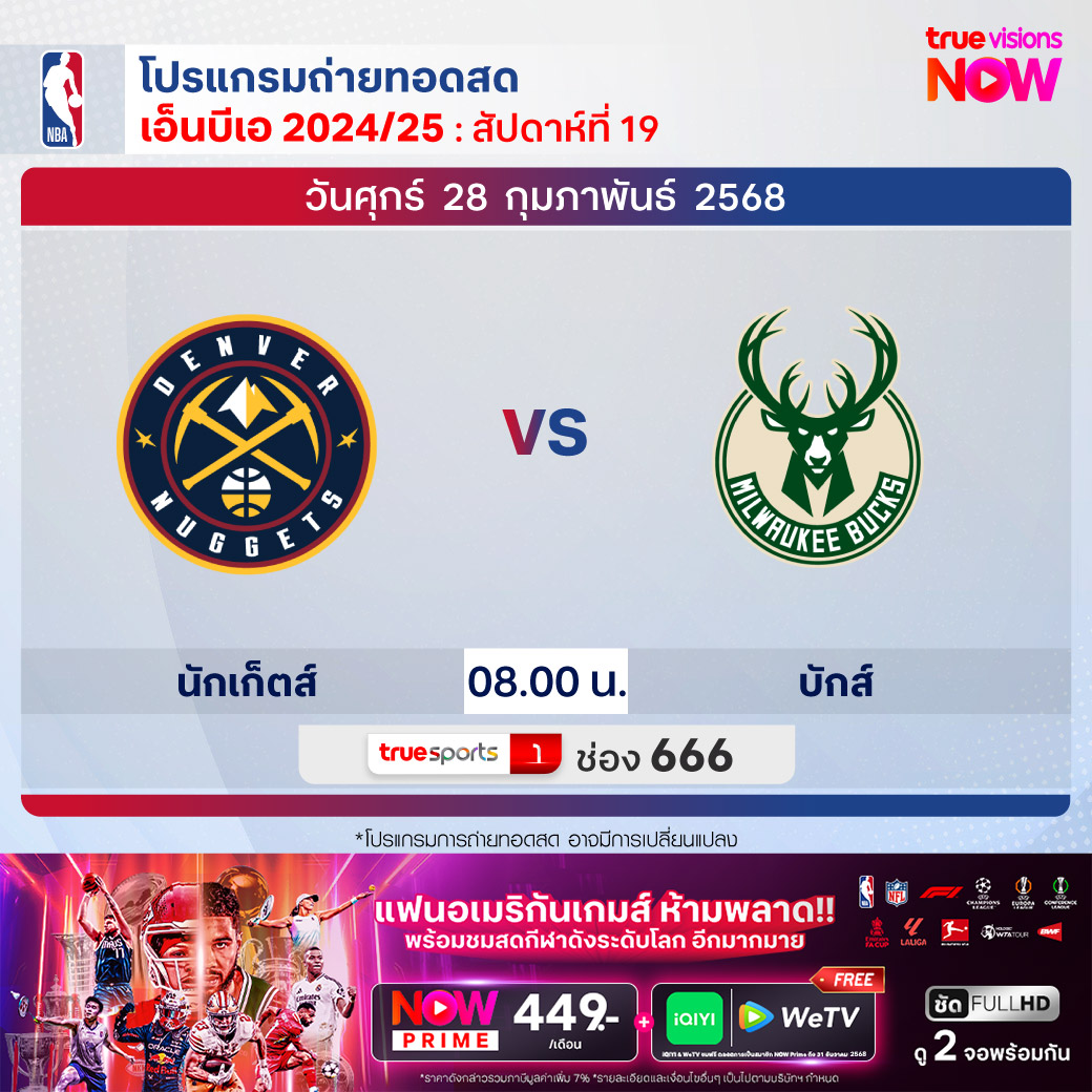 วันศุกร์ 28 ก.พ. Nuggets Vs Bucks เวลา 08.00 ทางช่อง TS 1 (666)