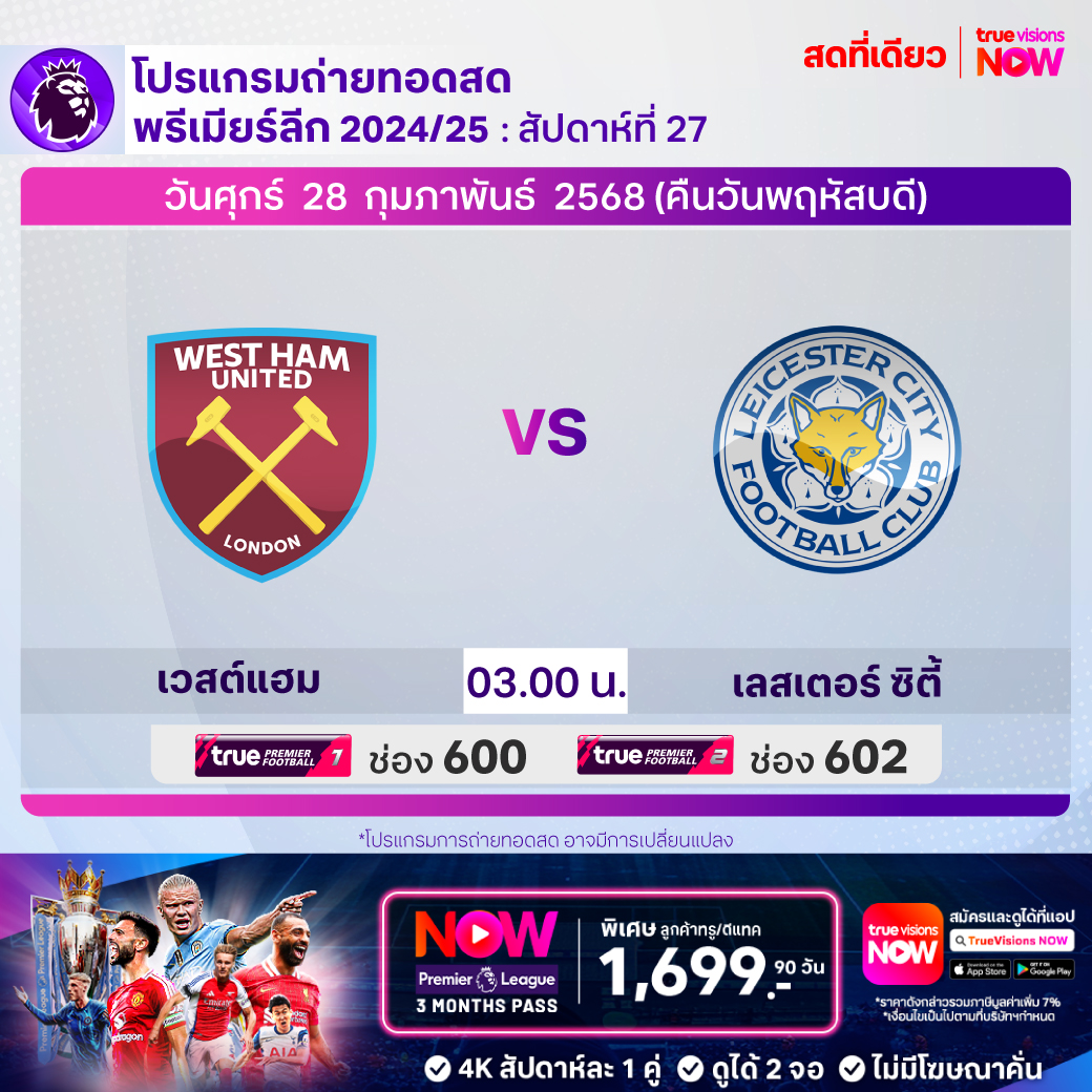 West Ham Utd vs Leicester City เวลา 03:00 - 05:00 ทางช่อง TPF 1 (600) / TPF 2 (602)