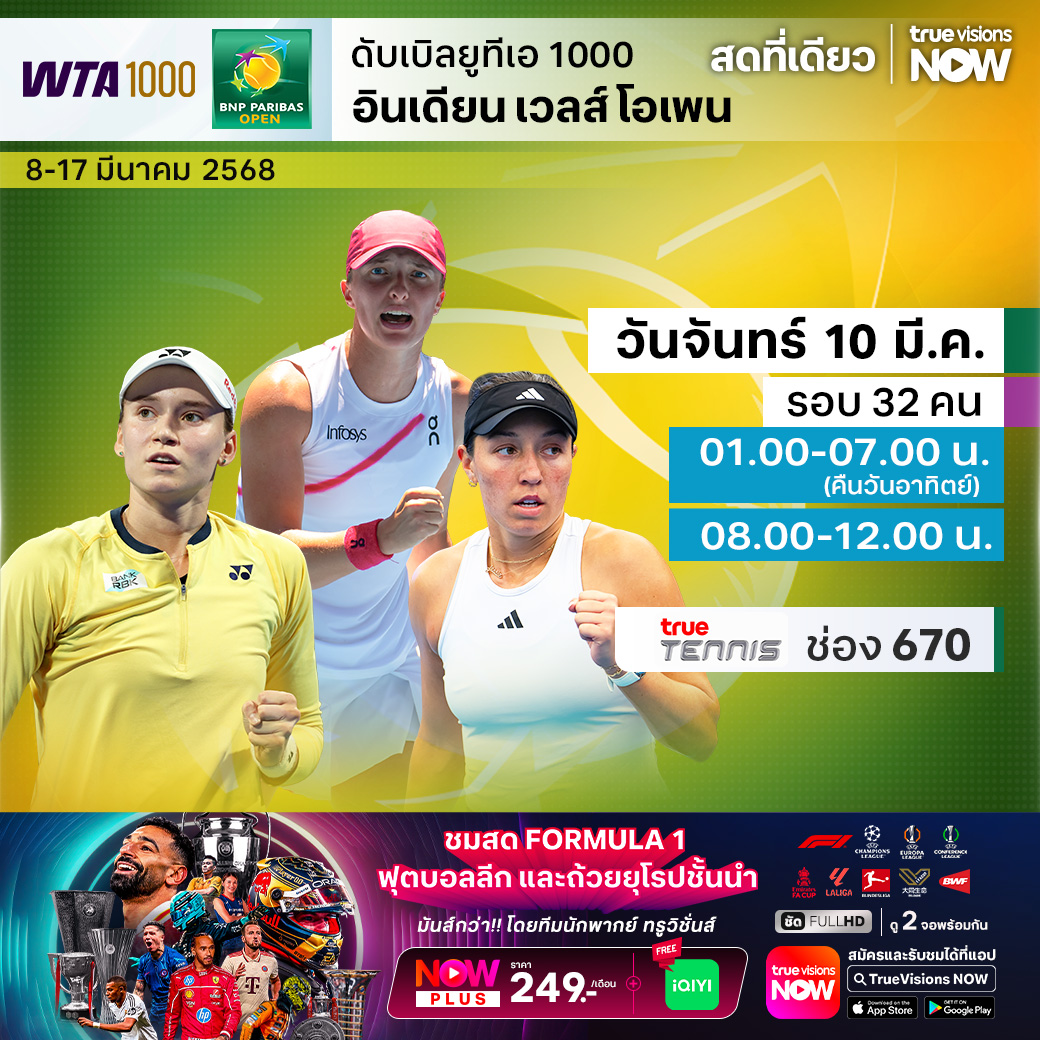 เทนนิส ดับเบิ้ลยูทีเอ ทัวร์ สัปดาห์นี้ พบกับรายการใหญ่ที่ได้รับการขนานนามว่าเป็นแกรนด์สแลมที่ 5 ของปี อินเดียน เวลส์ โอเพ่น เป็นรายการที่รวมนักกีฬาเทนนิสชื่อดังเข้าร่วมมากที่สุดและมีเงินรางวัลมากที่สุดรายการหนึ่ง ร่วมลุ้นกันว่าใครจะคว้าแชมป์ไปครอง ชมสด ครบทุกรอบ ที่ ทรูวิชั่นส์