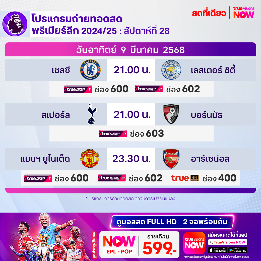 วันนี้มีอะไรดูที่ ทรูวิชั่นส์ ประจำวันอาทิตย์ที่ 9 มีนาคม 68 ยังคงมีกีฬาที่น่าสนใจให้ได้ตามลุ้นตามเชียร์กันเหมือนเดิม โดยในส่วนของฟุตบอลนั้นยังมีศึกพรีเมียร์ลีก อังกฤษ, บุนเดสลีกา เยอรมนี, ลา ลีกา สเปน, เอ-ลีก ออสเตรเลีย, เมเจอร์ลีก ซอคเก้อร์ และ ไทยลีก 1, 2 ให้ได้ตามเชียร์กันต่อ ส่วนกีฬาอื่นๆ ยังมี เทนนิส เอทีพี ทัวร์ และ ดับเบิ้ลยูทีเอ ทัวร์ รายการ อินเดียน เวลส์ โอเพ่น, กอล์ฟ พีจีเอ ทัวร์ รายการ อาร์โนลด์ พาลเมอร์ อินวิเตชั่นแนล, แอลพีจีเอ ทัวร์ รายการ บลู เบย์ แอลพีจีเอ, เวิลด์ สนุกเกอร์ ทัวร์ รายการ เวิลด์ กรังด์ปรีซ์, แบดมินตัน บีดับเบิ้ลยูเอฟ รายการ ออร์กเลอ็อง มาสเตอร์ส, ศึกยูเอฟซี 313, วอลเลย์บอล เอสวี ลีก, รักบี้ ซิกซ์ เนชั่นส์ และ บาสเกตบอลเอ็นบีเอ งานนี้ ทรูวิชั่นส์ จัดเต็มให้ชมกันถึงบ้าน