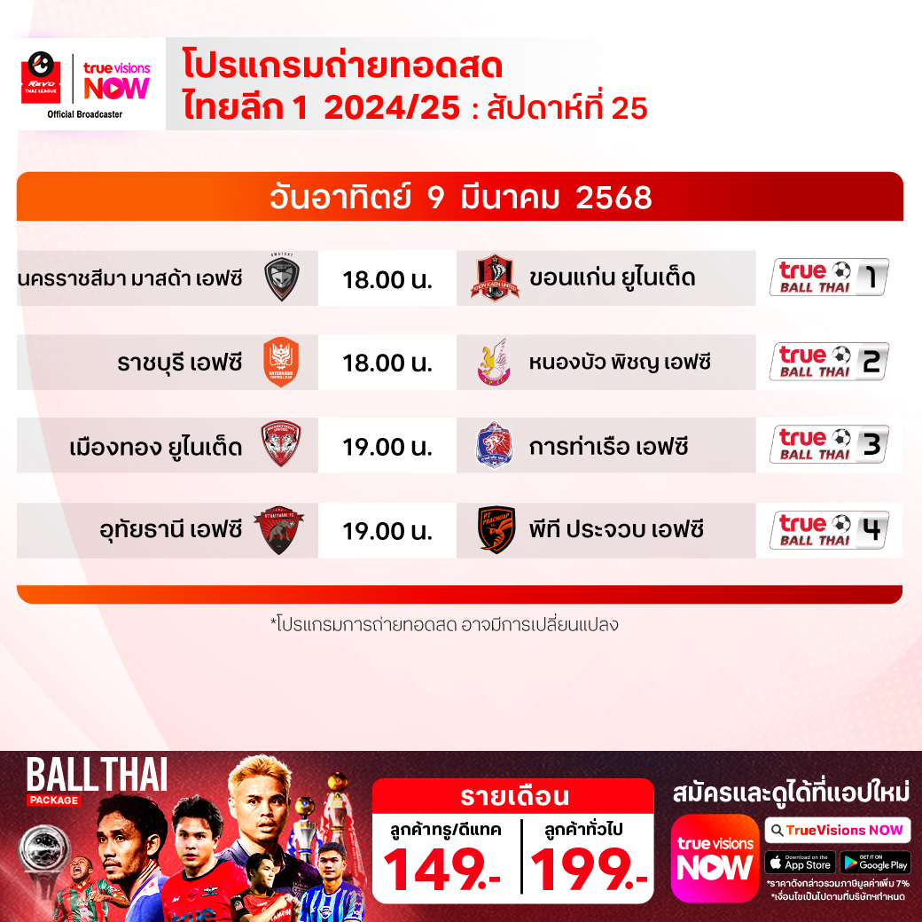 เมืองทอง ยูไนเต็ด พบ การท่าเรือ เอฟซี เวลา 19.00-21.00 ทางช่อง True Ball Thai 3