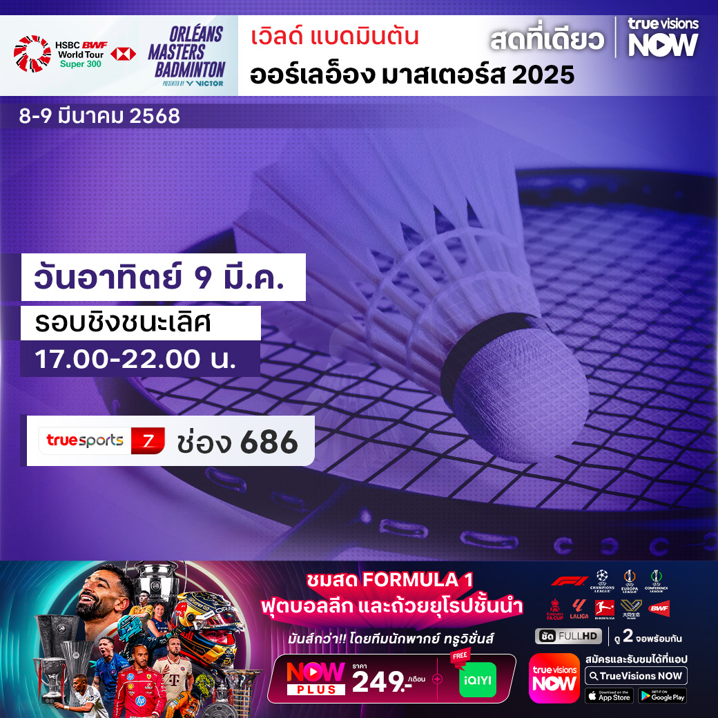 แบดมินตัน บีดับเบิ้ลยูเอฟ เก็บคะแนนสะสมโลก รายการ ออร์กเลอ็อง มาสเตอร์ส เป็นการเช็คความพร้อมสัปดาห์สุดท้าย ก่อนที่จะเดินหน้าร่วมศึกใหญ่สุดคลาสสิกอย่าง ออล อิงแลนด์ โอเพ่น แชมเปี้ยนชิพ ในสัปดาห์หน้า ร่วมส่งใจเชียร์ทีมแบดมินตันระดับโลก ชมสด เอ็กซ์คลูซีฟ ที่เดียวที่ ทรูวิชั่นส์