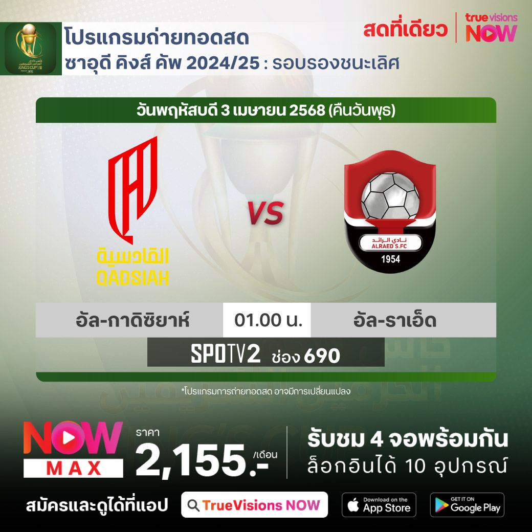 Al-Qadisiyah vs Al-Raed เวลา 01.00-03.00 ทางช่อง SPOTV2 (690)
