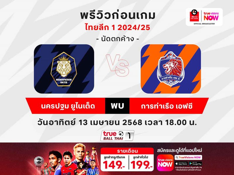 พรีวิวความพร้อมการแข่งขันฟุตบอลไทยลีก1 ประจำวันอาทิตย์ 13 เมษายน 2568 นครปฐม ยูไนเต็ด เปิดบ้านรับการมาเยือน การท่าเรือ เอฟซี