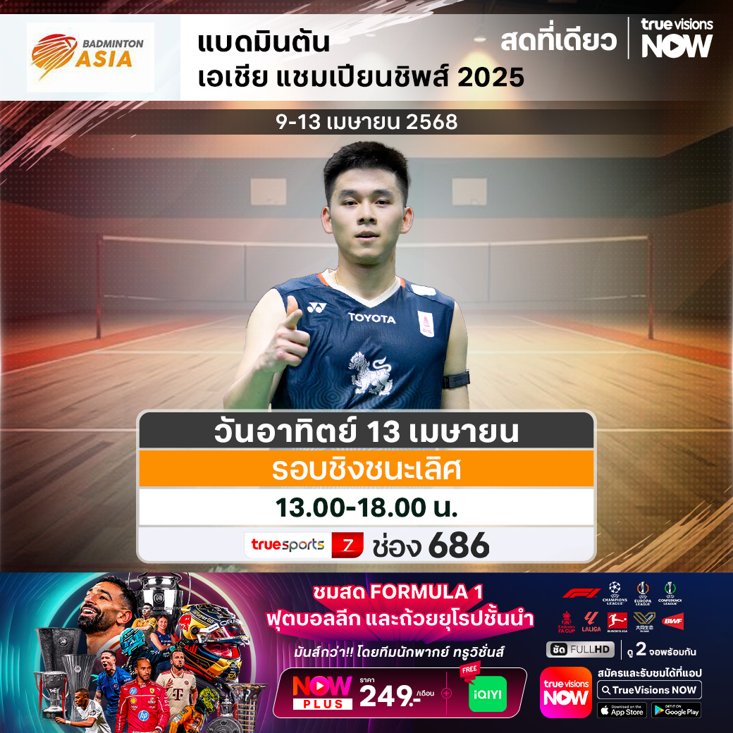 พลาดไม่ได้สำหรับแฟนๆ แบดมินตัน กับศึกแห่งศักดิ์ศรีระดับชิงแชมป์ทวีป ในรายการ แบดมินตัน เอเชีย แชมเปี้ยนชิพ 2025 ที่หนิงโป ประเทศจีน ร่วมเชียร์ ”วิว“ กุลวุฒิ วิทิตศานต์ ในรอบชิงชนะเลิศประเภทชายเดี่ยว เพื่อคว้าแแชมป์ในรายการนี้ให้ได้ ชมสด ครบทุกรอบ ที่เดียวที่ ทรูวิชั่นส์