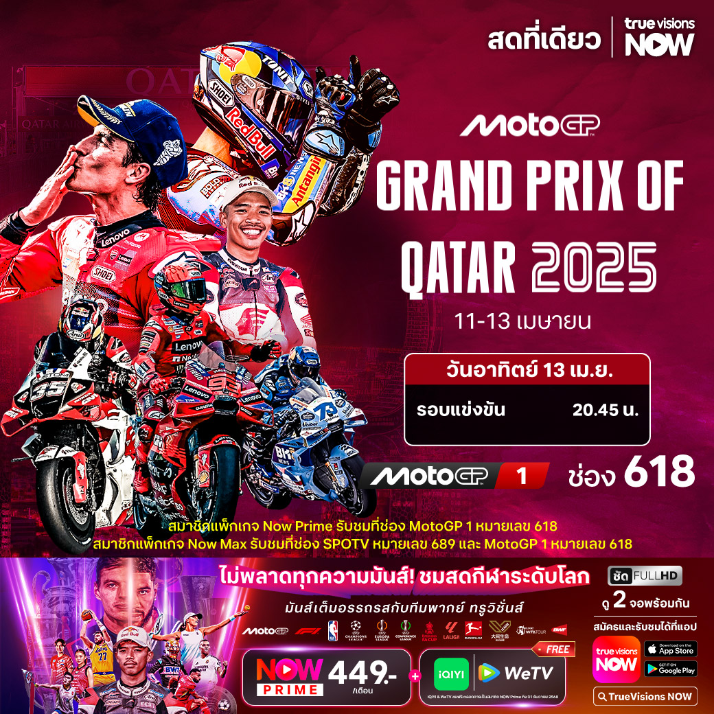โมโต จีพี เวิลด์ แชมเปี้ยนชิพ สัปดาห์นี้ ดวลวัดฝีมือและประลองความเป็นเจ้าพายุทะเลทราย กับศึก กาตาร์ กรังด์ปรีซ์ ที่สนาม ลูเซล อินเตอร์เนชั่นแนล เซอร์กิต กรุงโดฮา ประเทศกาตาร์ อย่าพลาดรุ่น โมโต จีพี ที่จะแย่งตำแหน่งกันอย่างเข้มข้น เร้าใจอย่างแน่นอน ชมสด เอ็กซ์คลูซีฟ ครบทุกรุ่น ทุกช่วง ที่เดียวที่ ทรูวิชั่นส์