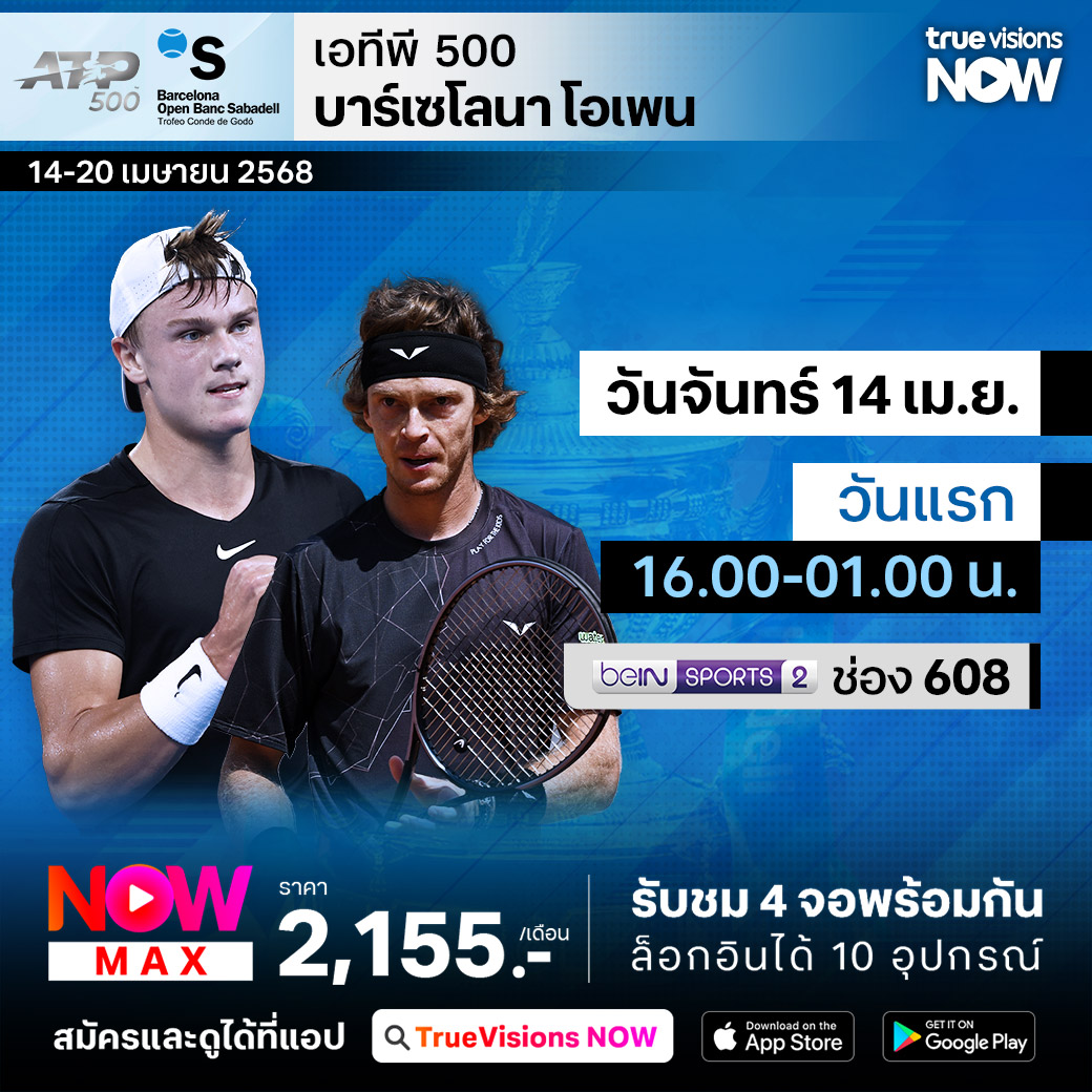 เทนนิสชายเริ่มเข้าสู่การแข่งขันคอร์ทดินกันอย่างเข้มข้น สัปดาห์นี้ไปกันที่รายการระดับ ATP 500 ที่เมืองบาร์เซโลน่า ประเทศสเปน ในรายการ บาร์เซโลน่า โอเพ่น เป็นรายการให้นักกีฬาได้เตรียมความพร้อมก่อนเข้าสู่รายการใหญ่ที่กรุงมาดริดต่อไป นักเทนนิสมือระดับโลกเข้าร่วมแข่งขันกันคับคั่ง นำโดย คาร์ลอส อัลคาราซ นักเทนนิสขวัญใจชาวสเปน ชมสด ครบทุกรอบ ที่ ทรูวิชั่นส์