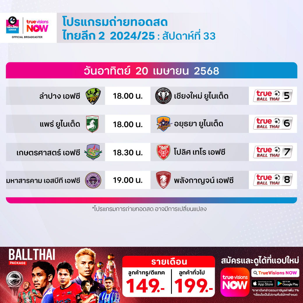 แพร่ ยูไนเต็ด พบ อยุธยา ยูไนเต็ด เวลา 18.00-20.00 ทางช่อง True Ball Thai 6