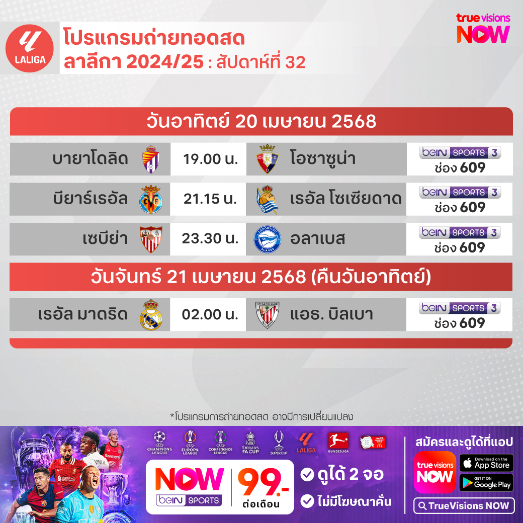 วันนี้มีอะไรดูที่ ทรูวิชั่นส์ ประจำวันอาทิตย์ที่ 20 เมษายน 68 ยังคงมีกีฬาที่น่าสนใจให้ได้ตามลุ้นตามเชียร์กันเหมือนเดิม โดยในส่วนของฟุตบอลนั้นยังมีศึกพรีเมียร์ลีก อังกฤษ, บุนเดสลีกา เยอรมนี, ลา ลีกา สเปน, เอ-ลีก ออสเตรเลีย และ ไทยลีก 1, 2 ให้ได้ตามเชียร์กันต่อ ส่วนกีฬาอื่นๆ คอมอเตอร์สปอร์ตพลาดไม่ได้กับศึก ฟอร์มูล่า วัน สนามที่ 5 รายการ ซาอุดิอาระเบียน กรังด์ปรีซ์ นอกจากนี้ยังมีเทนนิส เอทีพี ทัวร์ รายการ บาร์เซโลน่า โอเพ่น, ดับเบิ้ลยูทีเอ ทัวร์ รายการ สตุ๊ตการ์ท โอเพ่น, กอล์ฟ พีจีเอ ทัวร์ รายการ อาร์บีซี เฮอร์ริเทจ, ดีพี เวิลด์ ทัวร์ รายการ วอลโว่ ไชน่า โอเพ่น และ แอลพีจีเอ ทัวร์ รายการ เจเอ็ม แอลเอ แชมเปี้ยนชิพ, เวิลด์ สนุกเกอร์ ทัวร์ รายการ เวิลด์ แชมเปี้ยนชิพ, วอลเลย์บอล เอสวี ลีก และ บาสเกตบอลเอ็นบีเอ งานนี้ ทรูวิชั่นส์ จัดเต็มให้ชมกันถึงบ้าน