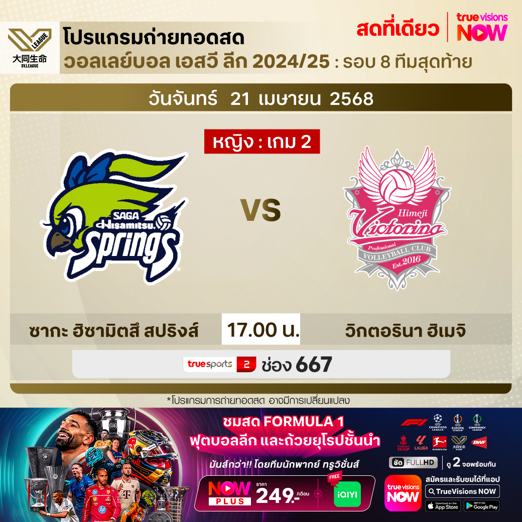 ซากะ ฮิซามิตสึ สปริงส์ พบ วิกตอรินา ฮิเมจิ เวลา 17.00 - 19.30 ทางช่อง TS 2 (667)