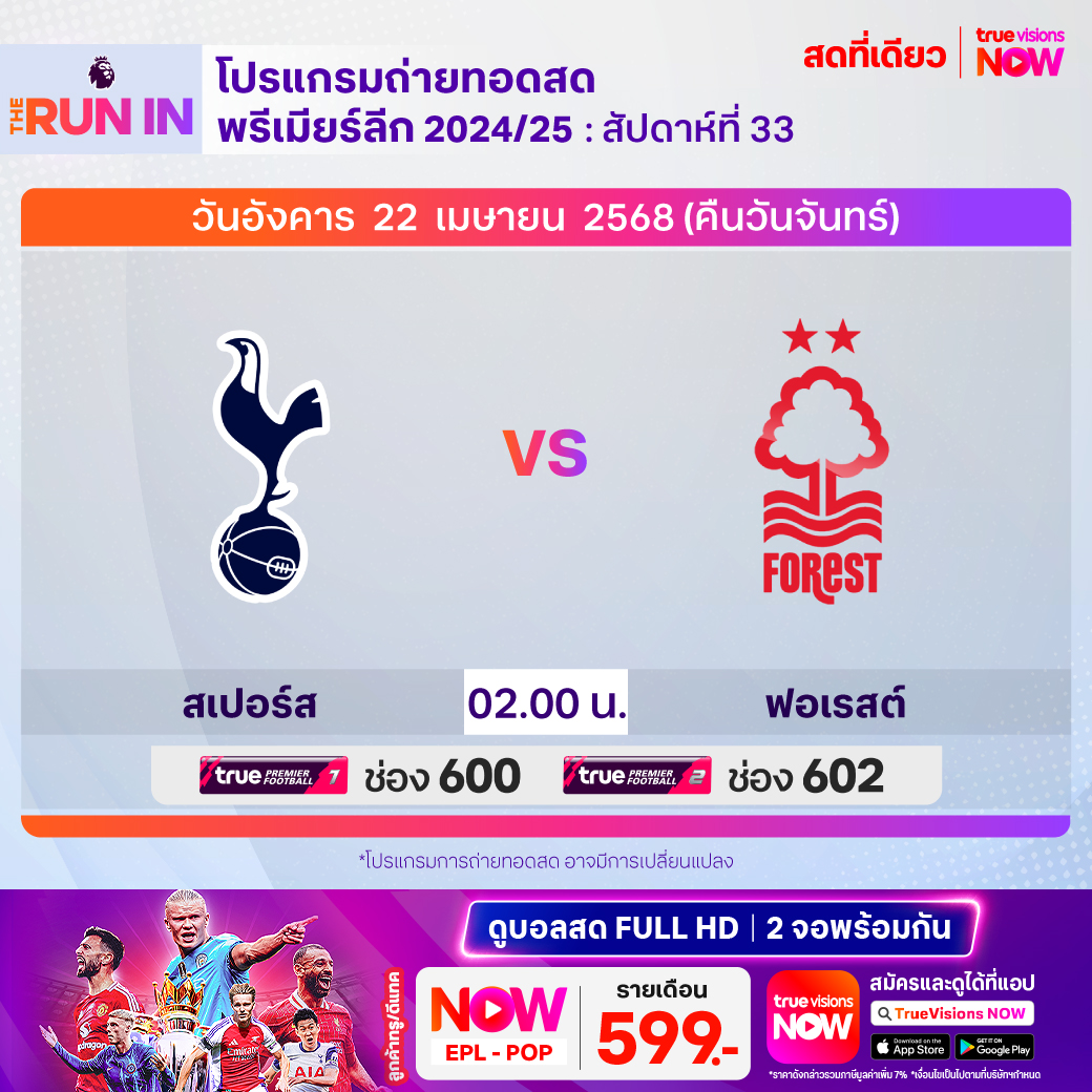 Tottenham Hotspur vs Nottingham Forest เวลา 02:00 - 04:00 ทางช่อง TPF 1 (600) / TPF 2 (602)