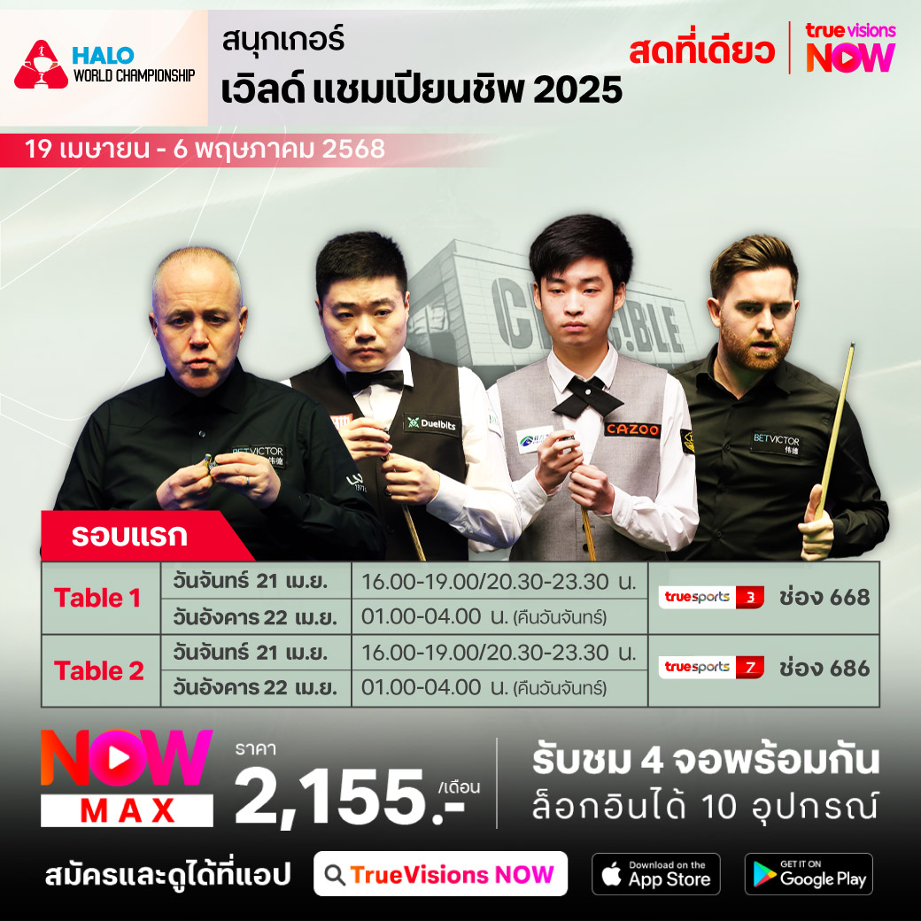ไม่ต้องรออีกต่อไป เมื่อความยิ่งใหญ่ที่แฟนๆ รอคอยมาถึงแล้ว กับศึก เวิลด์ สนุกเกอร์ ทัวร์ รายกาย เวิลด์ แชมเปี้ยนชิพ หรือสนุกเกอร์ชิงแชมป์โลก รายการที่เก่าแก่และและยิ่งใหญ่ที่สุด เปิดฉากขึ้นแล้วที่สังเวียน ครูซิเบิ้ล เธียเตอร์ อันศักดิ์สิทธิ์ ในเมืองเชฟฟิลด์ ประเทศอังกฤษ ชมเกมสดๆ การันตีครบทุกแมตช์ตลอด 17 วันเต็ม ร่วมลุ้นกันว่าใครจะก้าวขึ้นสู่บัลลังก์แชมป์โลกอันทรงเกียรติในปีนี้ ชมสด เอ็กซ์คลูซีฟ ที่เดียวที่ ทรูวิชั่นส์