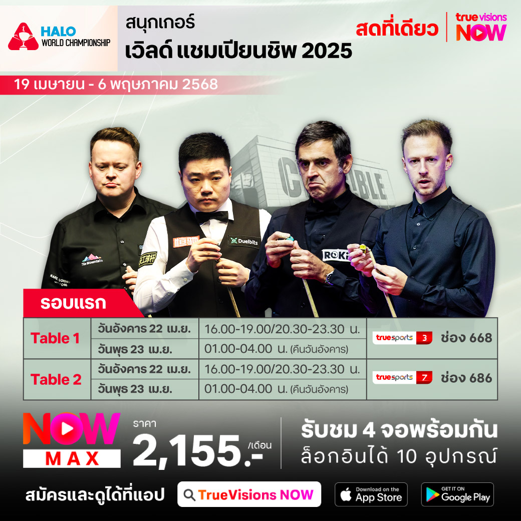 ไม่ต้องรออีกต่อไป เมื่อความยิ่งใหญ่ที่แฟนๆ รอคอยมาถึงแล้ว กับศึก เวิลด์ สนุกเกอร์ ทัวร์ รายกาย เวิลด์ แชมเปี้ยนชิพ หรือสนุกเกอร์ชิงแชมป์โลก รายการที่เก่าแก่และและยิ่งใหญ่ที่สุด เปิดฉากขึ้นแล้วที่สังเวียน ครูซิเบิ้ล เธียเตอร์ อันศักดิ์สิทธิ์ ในเมืองเชฟฟิลด์ ประเทศอังกฤษ ชมเกมสดๆ การันตีครบทุกแมตช์ตลอด 17 วันเต็ม ร่วมลุ้นกันว่าใครจะก้าวขึ้นสู่บัลลังก์แชมป์โลกอันทรงเกียรติในปีนี้ ชมสด เอ็กซ์คลูซีฟ ที่เดียวที่ ทรูวิชั่นส์