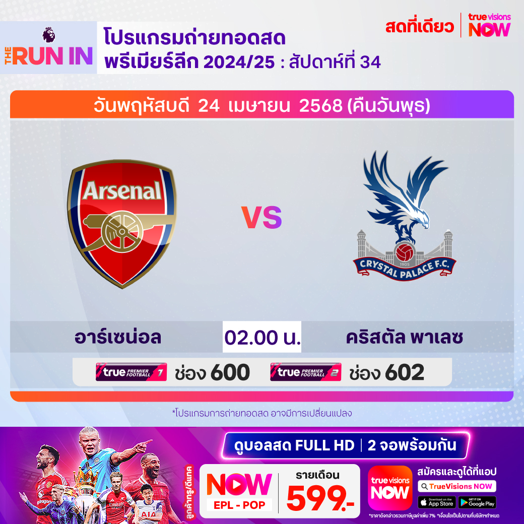 Arsenal vs Crystal Palace เวลา 02:00 - 04:00 ทางช่อง TPF 1 (600) / TPF 2 (602)